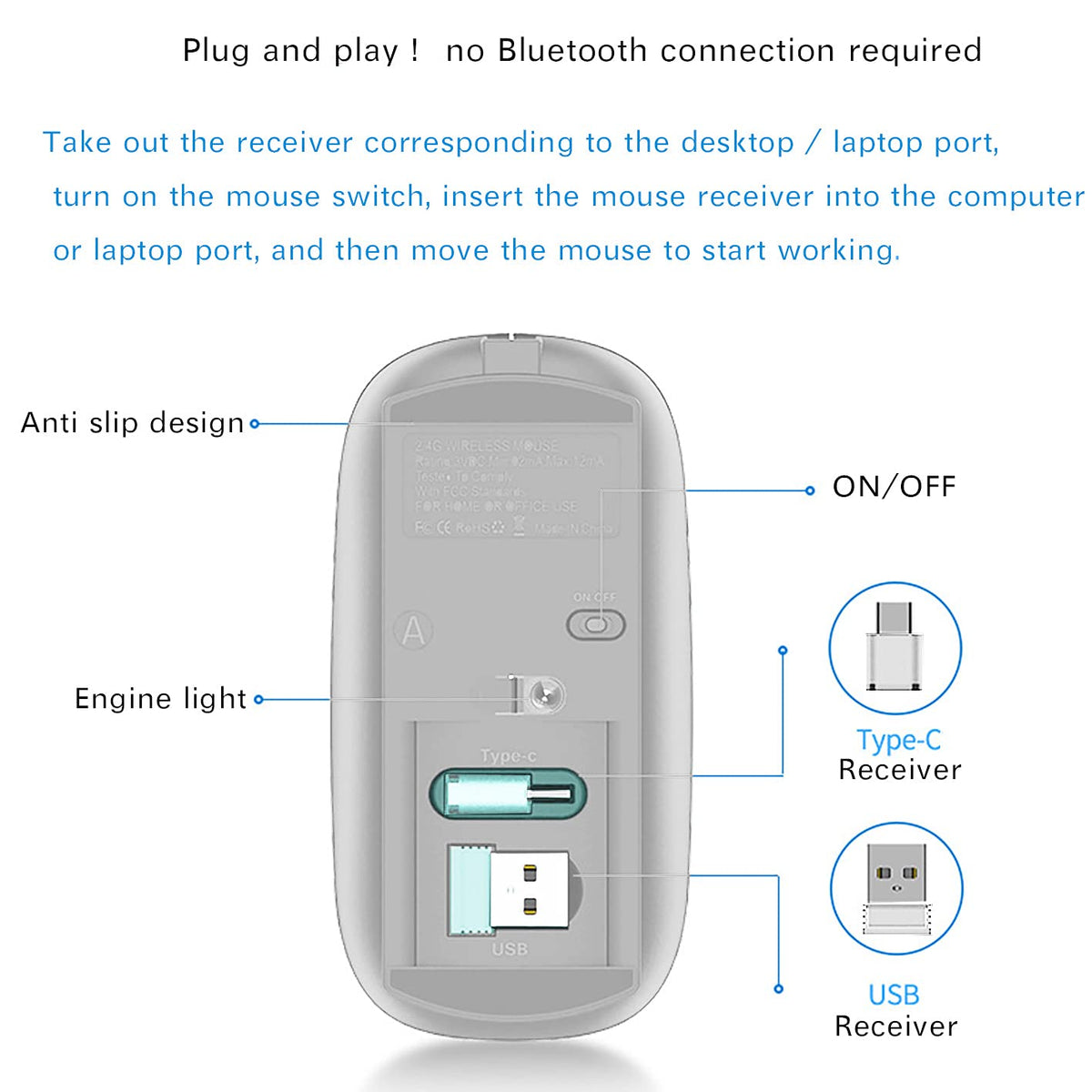 How Do I Use This Wireless Mouse On My Laptop? 1: Remove The Usb Receiver Or Type C Receiver At The Bottom Of The Mouse (Remove The Receiver Suitable For Your Computer/Laptop Port) And Plug The Receiver Into The Port Of Your Computer /Laptop 2: Turn On The Mouse Switch, Move The Mouse Or Press The Left And Right Mouse Buttons, And The Mouse Will Start Working On Your Computer Desktop,Plug And Play, Only Need 2 Steps To Use.