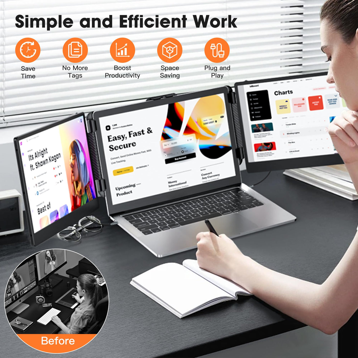 Q: How do I set up the JJTechGiant Triple Portable Monitor?A: Setting up the JJTechGiant Triple Portable Monitor is simple and user-friendly. It features a plug-and-play design that requires no driver installation. Just connect it to your laptop using the provided cables, and you're ready to extend your display.