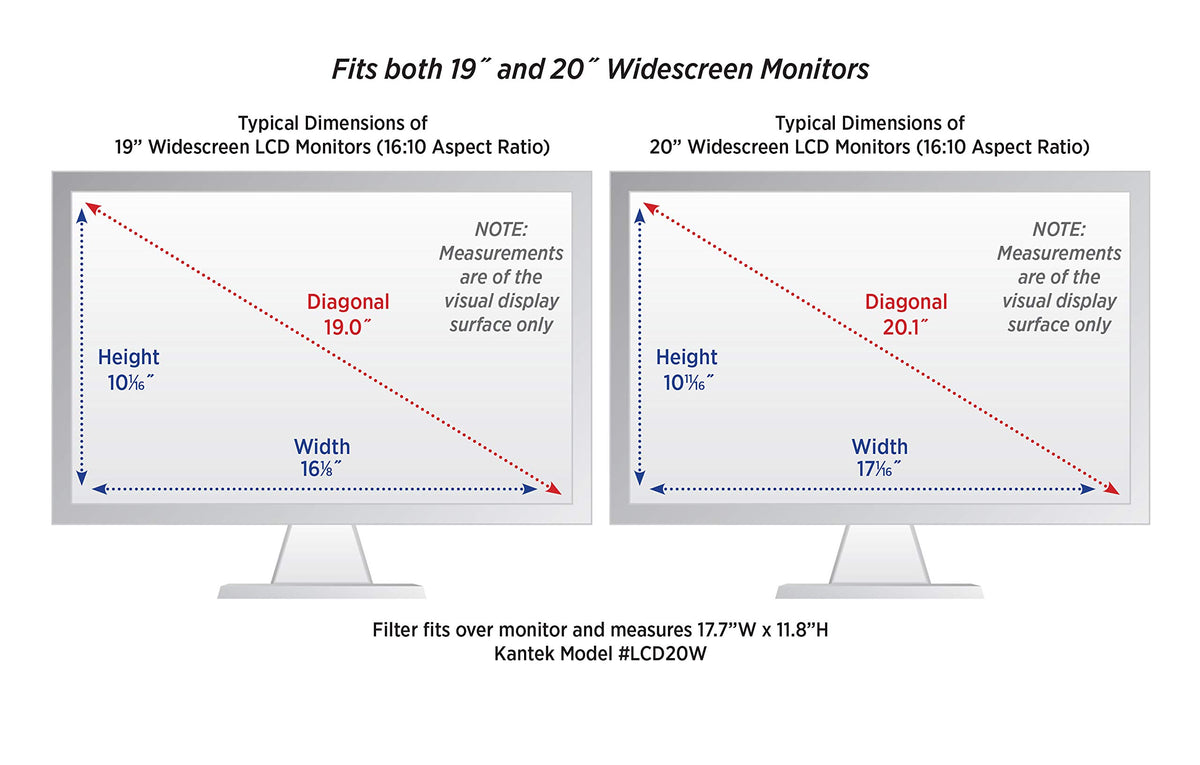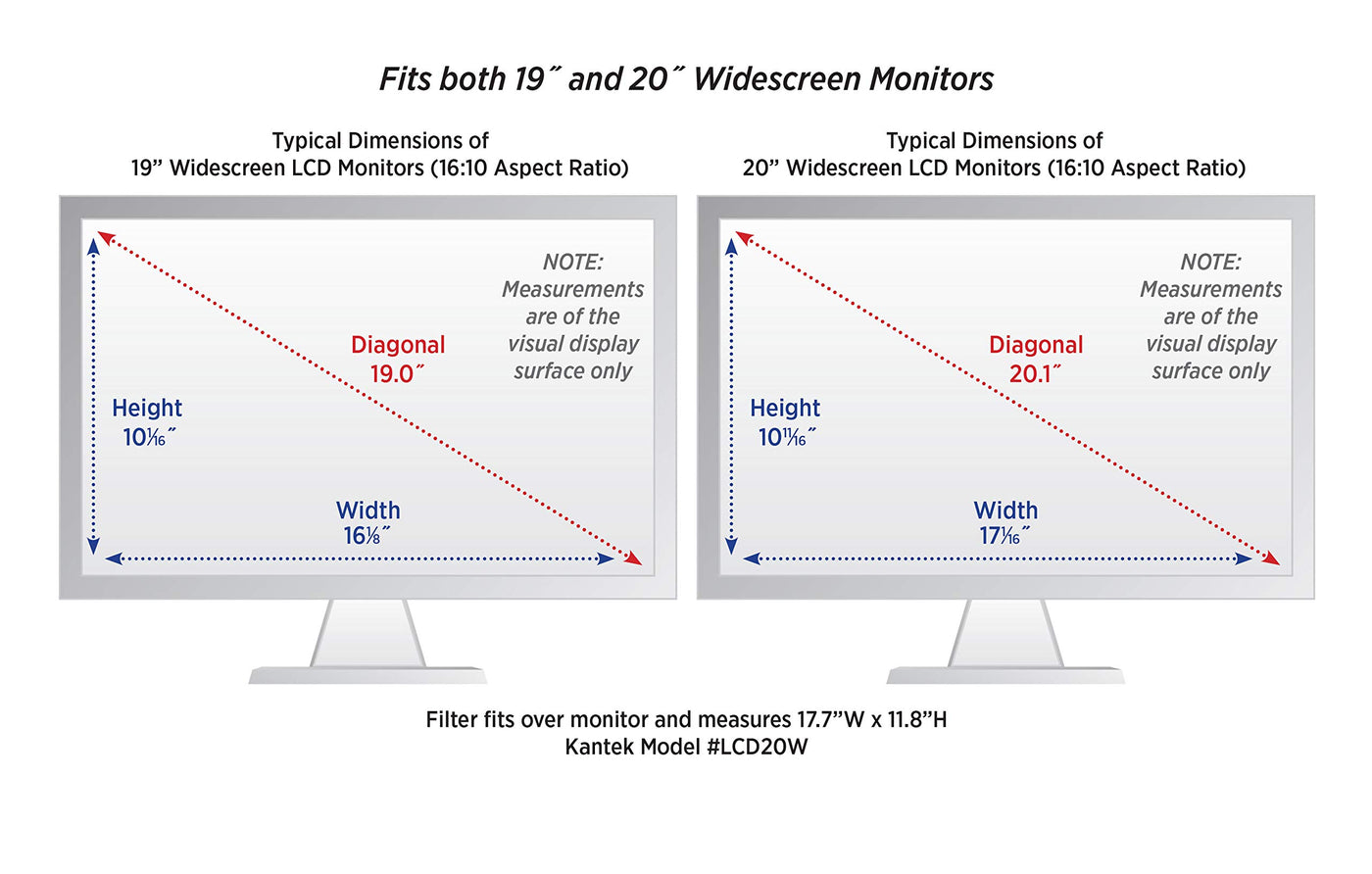 Antireflective coating reduces glare by 95%, improves image and enhances contrast to help prevent eyestrain and thereby reduce fatigue. (Not designed to filter out high direct glare from a light source shining directly on the monitor, such as a direct window or overhead lighting). Fully assembled; simple hanging bracket mounting; elegant frameless design with silver trim. Natural light tint for true color fidelity. Protects LCD display surface. Fits both 19 and 20-Inch Widescreen LCD monitors. The actual filter measures 17.7' W x 11.8' H, and fits over the front of the entire monitor. (19' Widescreen monitors have a 19.0' viewable diagonal and the viewing area is 16 1/8' W x 10 1/16' H. 20' Widescreen monitors have a 20.1' viewable diagonal and the viewing area is 17 1/16' W x 10 11/16' H) Before Choosing your screen, use measuring instructions in image to left to ensure you choose appropriately. (Full measuring instructions and chart of all available filter sizes available in Technical Specifications below) About us: - Founded in 1982 as one of the first manufacturers of Anti-Glare Filters for personal computers, Kantek has always been an industry pioneer. Focusing on the needs of our customers, amid a rapidly changing marketplace, has led to our continued growth with an ever expanding and evolving product line.