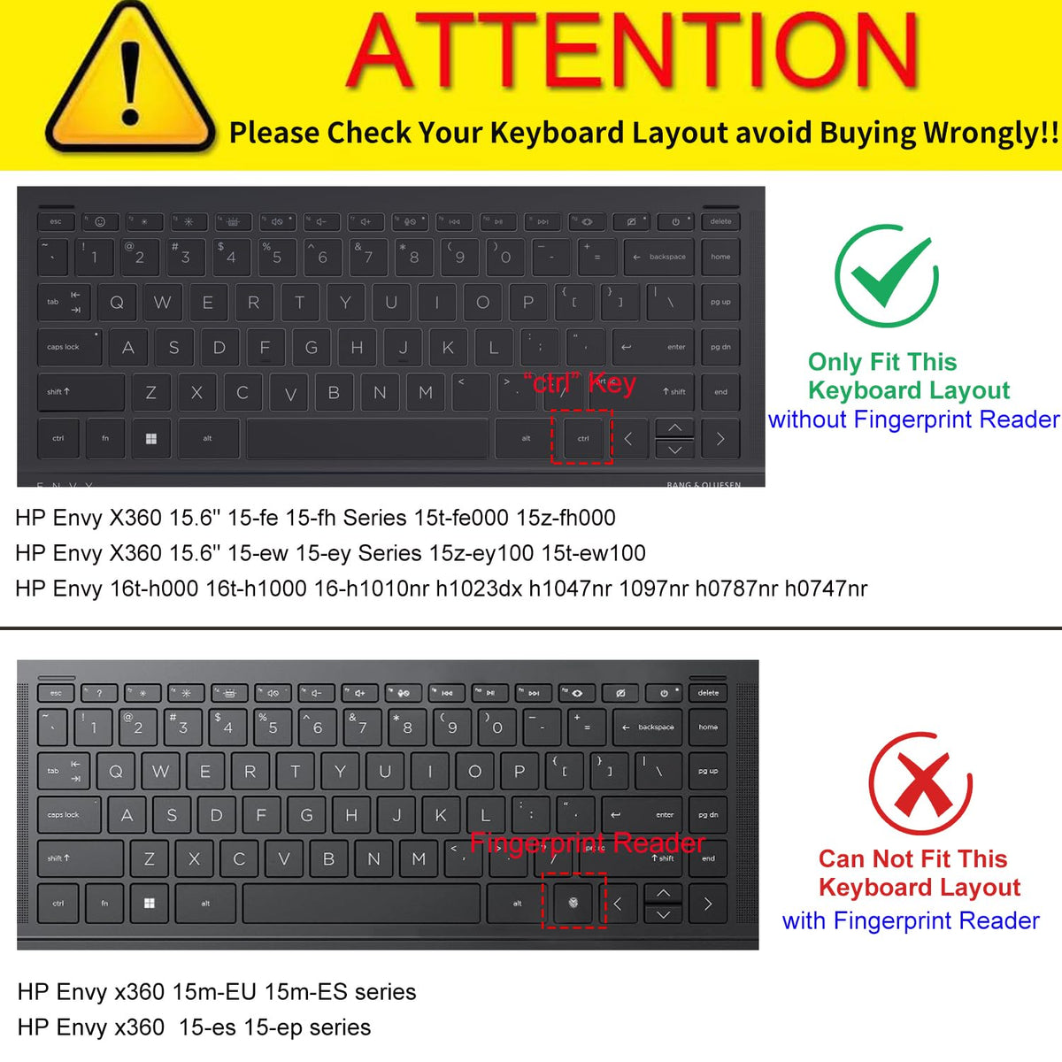 Q: Is this keyboard cover compatible with my HP Envy X360 15.6 laptop?A: Yes, this keyboard cover is designed to be compatible with various models of the HP Envy X360 15.6, including 15-fe, 15t-fe, 15-fh, 15-ey, and more. Please ensure you check the specific model numbers listed in the product description to confirm compatibility.