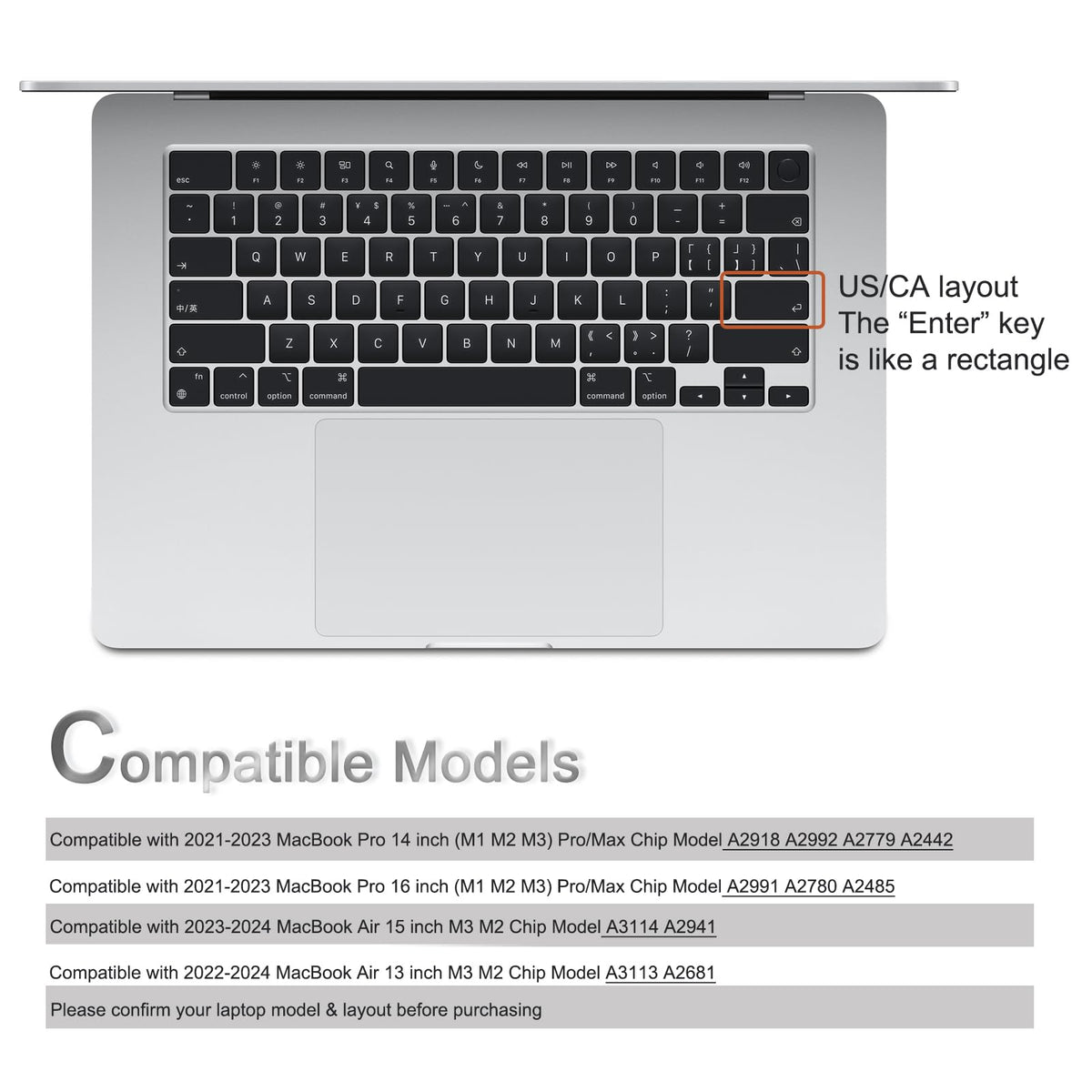 Compatible Model: Compatible With 2024-2021 Macbook Air & Pro/Max With M3 M2 M1 Chip 15.3'' 13.6'' 14.2'' 16.2 Inches A2941 A2681 A3114 A3113 A2992 A2991 A2918 A2779 A2780 A2442 A2485 Us And Ca Layout (The Apperance Of Enter Key Is Like The Rectangle ). Please Confirm Your Product Model Before Purchasing