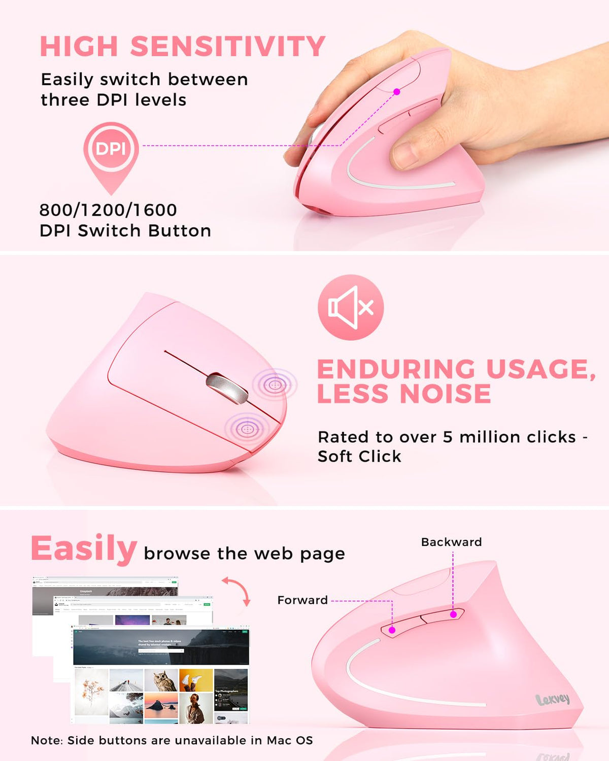 Lekvey Ergonomic Mouse, Vertical Wireless Mouse, Rechargeable 2.4 Ghz Usb Optical Carpal Tunnel Mice : 800/1200 / 1600 Dpi, 6 Buttons, For Laptop, Pc, Computer, Desktop, Notebook Etc, Pink