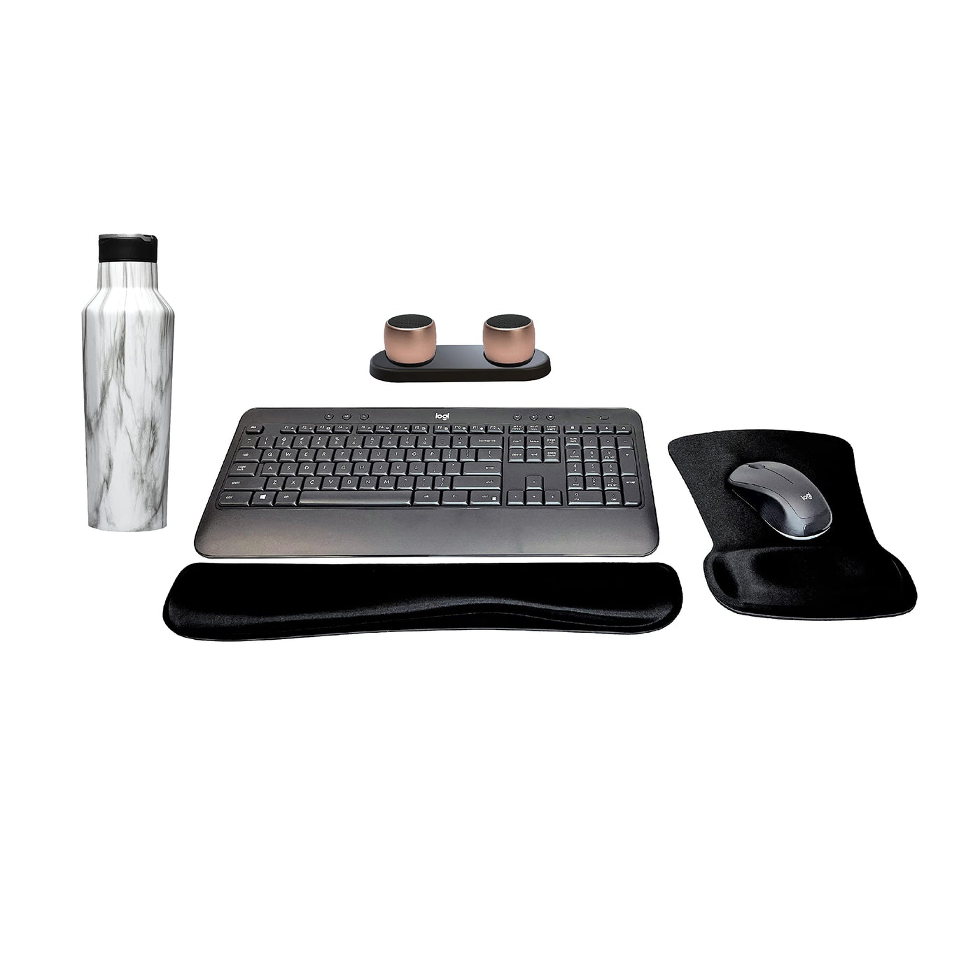 This Is The Active Lifestyle Home, Office Bundle For Your Busy Life. This Bundle Offers Products So Convenient, Portable, & Fashionable, Without Sacrificing Performance, Functionality, & Versatility. Includes Logitech Mk540 Advanced Usb Keyboard & Mouse, Gel Wrist Pad & Mouse Pad, 2 Pro Bluetooth Speakers With Wireless Charging Tray, & Canteen. Keyboard & Mouse Combo Features Full-Size Board With Numeric Keypad, Shortcut Keys & Strong Wireless Connection. Includes Unifying Wireless Receiver. No Delays Or Drop Out Connections With 2.4Ghz To Ensure Reliable Connection. Canteen Is Ergonomically Designed To Stay Secure, Leakproof, & At Optimal Temperature. Pro Speakers Are One Of The Smallest Wireless Speakers, Weighing 1.9 Oz. With A 1.47 In. Diameter Each, While Boasting Exceptional Sound Quality. Speakers Come With Micro Usb Charging Cord. Speaker Dimensions: 42.5 Mm X 33 Mm (1.67'' X 1.29'') - Speaker Battery Capacity: 400Mah Speaker Playback Time: Up To 4 Hours