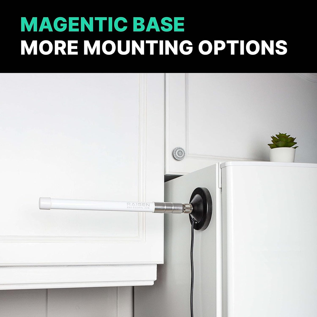 Q: How do I install the antenna and magnetic base?A: The antenna comes with a high-strength magnetic base that allows for secure mounting on any flat metallic surface. For optimal performance, position the antenna as high as possible, such as on a roof or attic, to reduce obstructions.