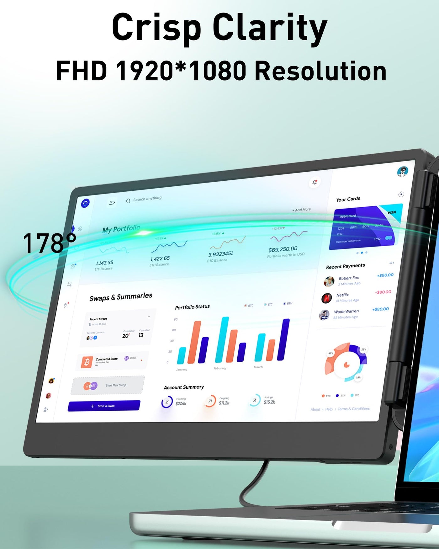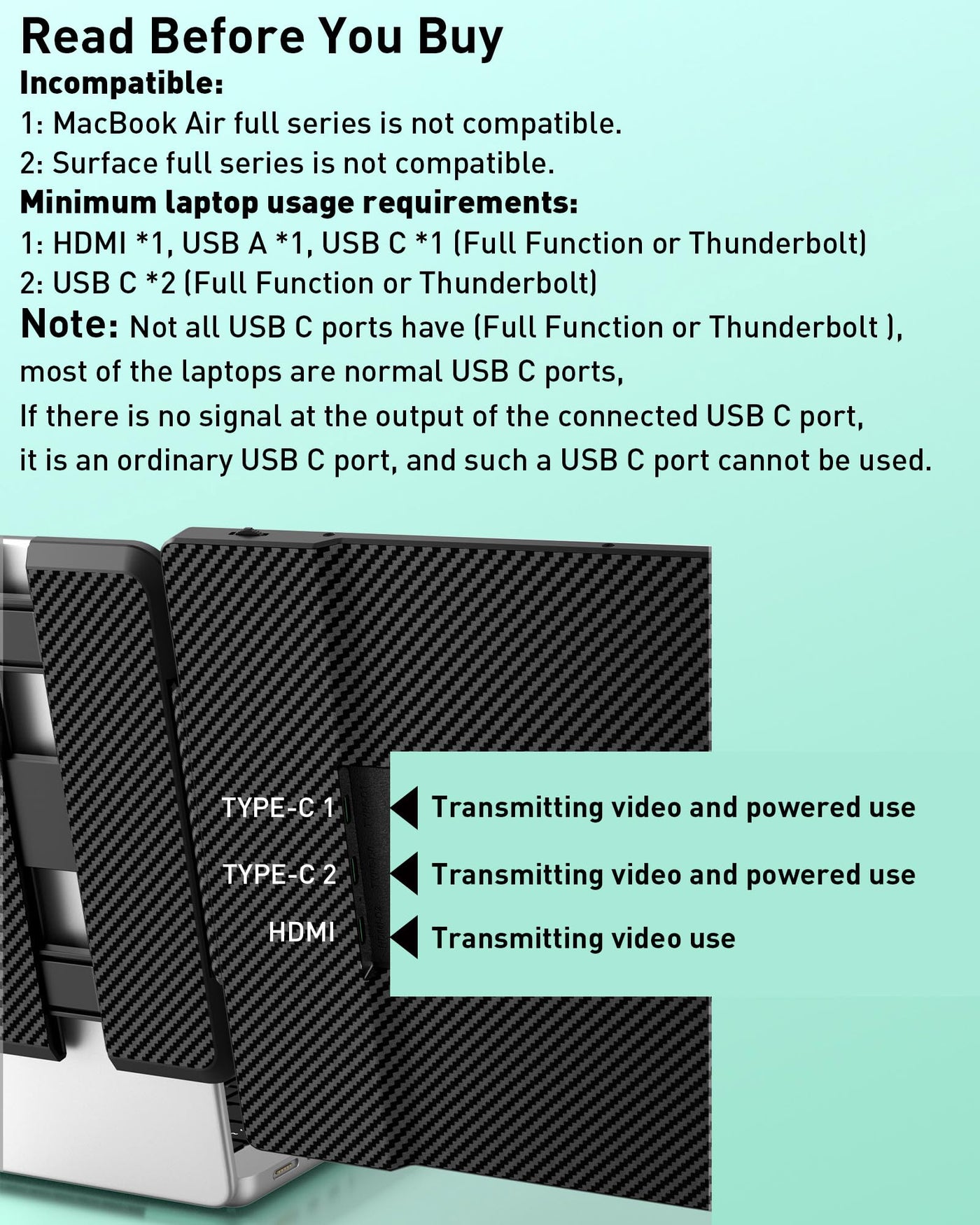 Triple Monitor Productivity: Transform Your Laptop Into A Triple-Screen Workstation With The Marsmyth S2. Enhance Your Multitasking Capabilities And Productivity By Adding Two Additional 14'' Hd Monitors, Perfect For Professionals, Gamers, And Content Creators. | Seamless Compatibility: Enjoy Hassle-Free Compatibility With A Wide Range Of Devices, Including Windows Laptops, Macbooks, Surface Devices, Android Phones. The Marsmyth S2 Is Designed To Seamlessly Integrate Into Your Tech Ecosystem. | Enhanced Connectivity With H5-T Cable: We'Ve Addressed Compatibility Concerns By Including The H5-T Data Cable, Ensuring A Stable Connection Between The Hdmi Interface And Type-C Ports. Experience A Smooth, Uninterrupted Workflow Without Worrying About M1/M2/M3 Chips Compatibility Issues. | Plug & Play: The Marsmyth S2 Is Your Productivity Solution. With A 1080P Hd Display, This Portable Monitor Is Perfect For 13-17'' Laptops. Simply Plug It In, And You'Re Ready To Extend Your Screen Real Estate Without Any Complex Setups. | Versatile Applications: Whether You'Re Working, Gaming, Or Streaming, The Marsmyth S2 Adds Versatility To Your Computing Experience. Before Making A Purchase, Please Ensure That Your Laptop Has Sufficient Ports For Connection And That You Are Aware Of The Correct Way To Connect Your Device.