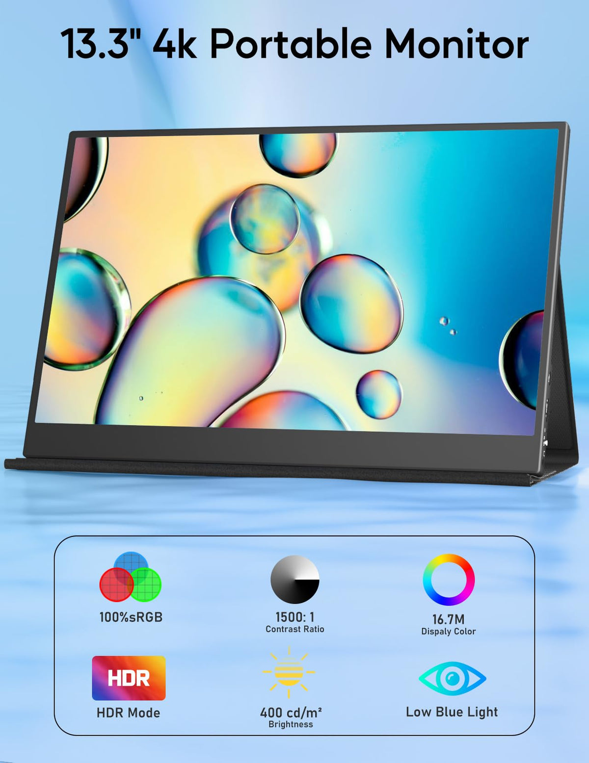 Feature: ?4K Portable Monitor?Ounshli Portable Monitor Equips 4K Ips Panel Technology, 3840X2160 Pixels Resolution , Which Is 4 Times Resolution Of 1080P Monitor, Resulting In Incredibly Sharp And Detailed Images. It'S Good Partner For Graphic Design, Photo Editing, Or Video Production. ?13.3 Slim Lightweight On The Go?: This Portable Monitor For Laptop Is Only 0.99 Lb Weight(Monitor Only) And 0.17'' (Min) Thickness. The Travel Monitor Is Easy To Slides Into Your Bag, Can Take It Wherever You Go. Let You Enjoy The Big Screen On The Go, Improve Work Efficiency Or Entertainment Atmosphere. ?100% Srgb And 1500:1 Contrast Ratio?13.3 External Screen With Wide Color Gamut - 100% Srgb, 16.7M Colors Displays, Higher Contrast Ratio - 1500:1, 400 Nits Brightness, Presents You With Vivid Images, Clear Motion And Details, Restore The Authenticity Of The Image & Video To A Greater Extent. ?Vesa Mountable & 90 Monitor Stand?: There Is A 90 Degree Adjustable Monitor Stand On The Back Of The Portable Laptop Monitor , You Can Adjust It According To Your Own Needs. Additionally, This Laptop Extended Monitor Supports Vesa With The Standard 75X75Mm Vesa Holes On The Back And Can Be Set To Landscape Or Portrait Mode As Desired. ?Plug And Play, Ease To Use?This Portable Gaming Monitor Includes Dual Usb-C 3.1 Full Function Port, A Hdmi Port, And A 3.5Mm Headphone Interface, Widely Compatible With Most Laptops, Pc, Ps4, Ps5, Xbox, Switch, Mac, Etc. More Importantly, The Usb Type-C Port Enables You To Power Up And Transmit Signal With Just One Cable Connection, Realizing Easy Work Anytime, Anywhere. Package: 1 X 4K Portable Monitor 1 X Mini Hdmi To Hdmi Cable 2 X Usb-C To Usb-C Data Cable 1 X Power Charger 1 X Pu Protective Case 1 X User Manual