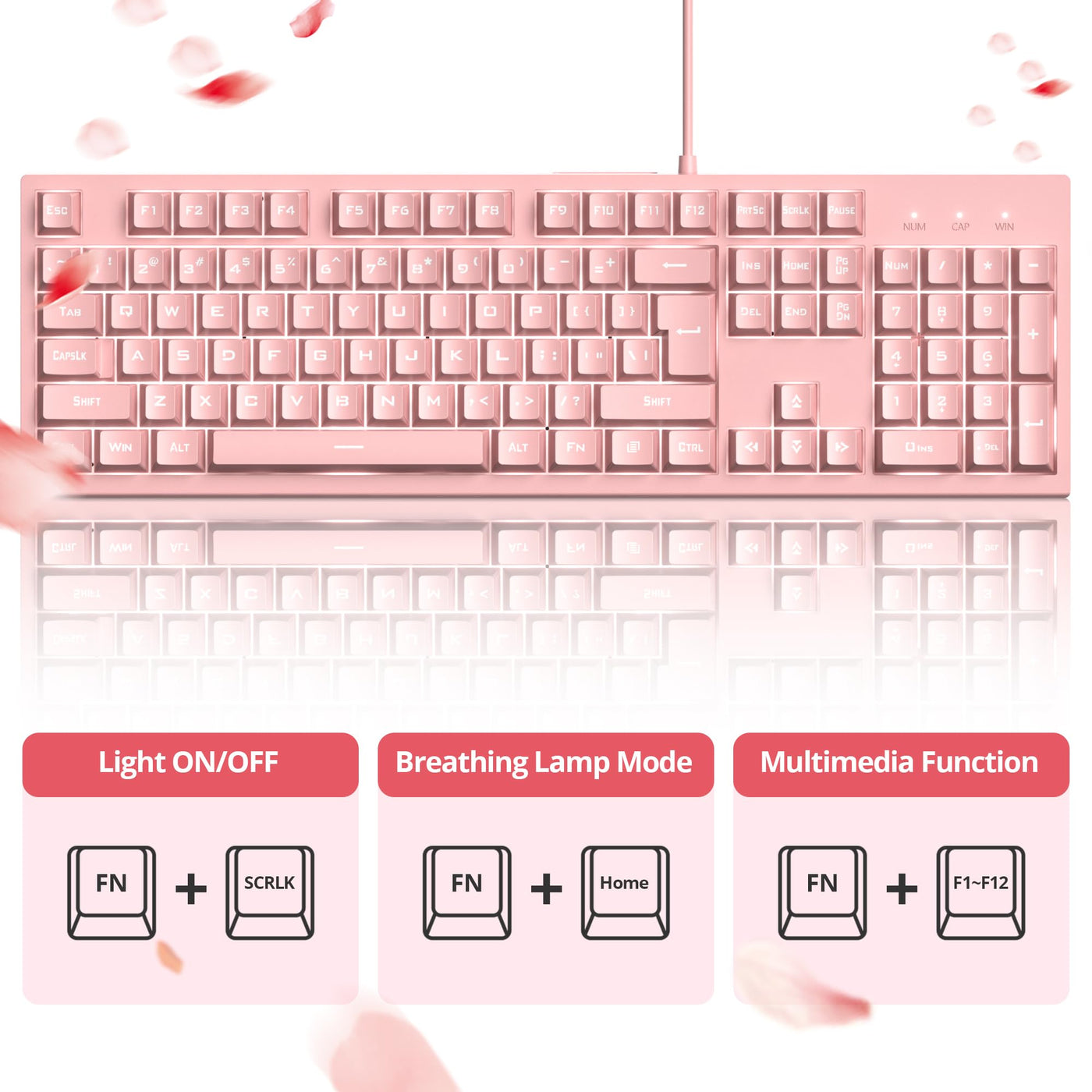 Q: What type of keyboard is the Owpkeenthy Pink Gaming Keyboard?A: The Owpkeenthy Pink Gaming Keyboard is a wired membrane keyboard featuring 104 keys with a mechanical feeling. It is designed for both gaming and office use, providing a quiet typing experience.