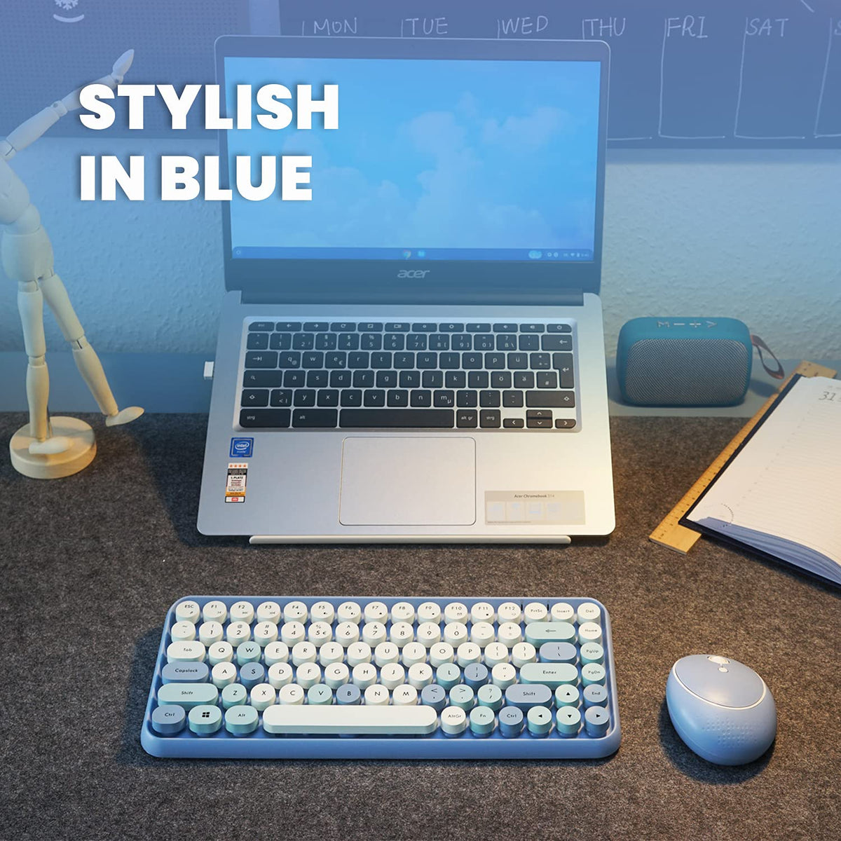 Stylish Desktop Set: A Compact Keyboard And Mouse In Shades Of Blue; With One Receiver For Both Products; Vintage Style Keyboard With Typewriter-Inspired Keys And A Rounded Mouse; Keyboard Dimensions: 12.60 X 5.40 X 1.18 Inches; Mouse Dimensions: 2.95 X 3.74 X 1.57 Inches | Wireless Connectivity: Equipped With A Wireless 2.4 Ghz Connection That Provides Stable And Uninterrupted Connection. Easy Setup And On/Off Switch On The Back Of The Mouse | Convenient Hotkeys: 12 Shortcut Keys To Easily Manage Your Media, Shortcuts For Emails, Screen Control, Internet, And Search Function | Mini Optical Mouse: A Blue Mouse With Three Buttons, Including An Adjustable Cursor Sensitivity Button In The Middle Of The Mouse (Dpi Levels: 800/1200/1600); 3 Level Power Saving Mode For The Mouse | System Compatibility: Designed For Windows 7, 8, 10, Uses 1 Usb Port For The Wireless Receiver; One Package Includes: Keyboard, Mouse, Manual