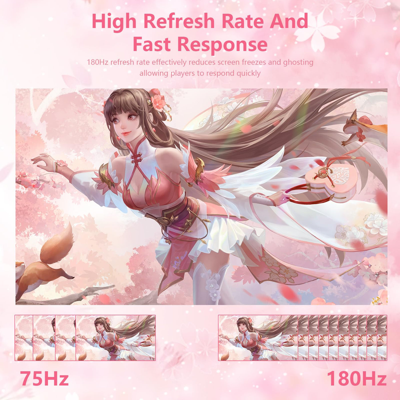 Q: What is the refresh rate of the Raywego Pink 27 inch Curved Gaming Monitor?A: The Raywego Pink 27 inch Curved Gaming Monitor features a rapid refresh rate of 180Hz when connected via DisplayPort, ensuring smooth gameplay and an immersive viewing experience.