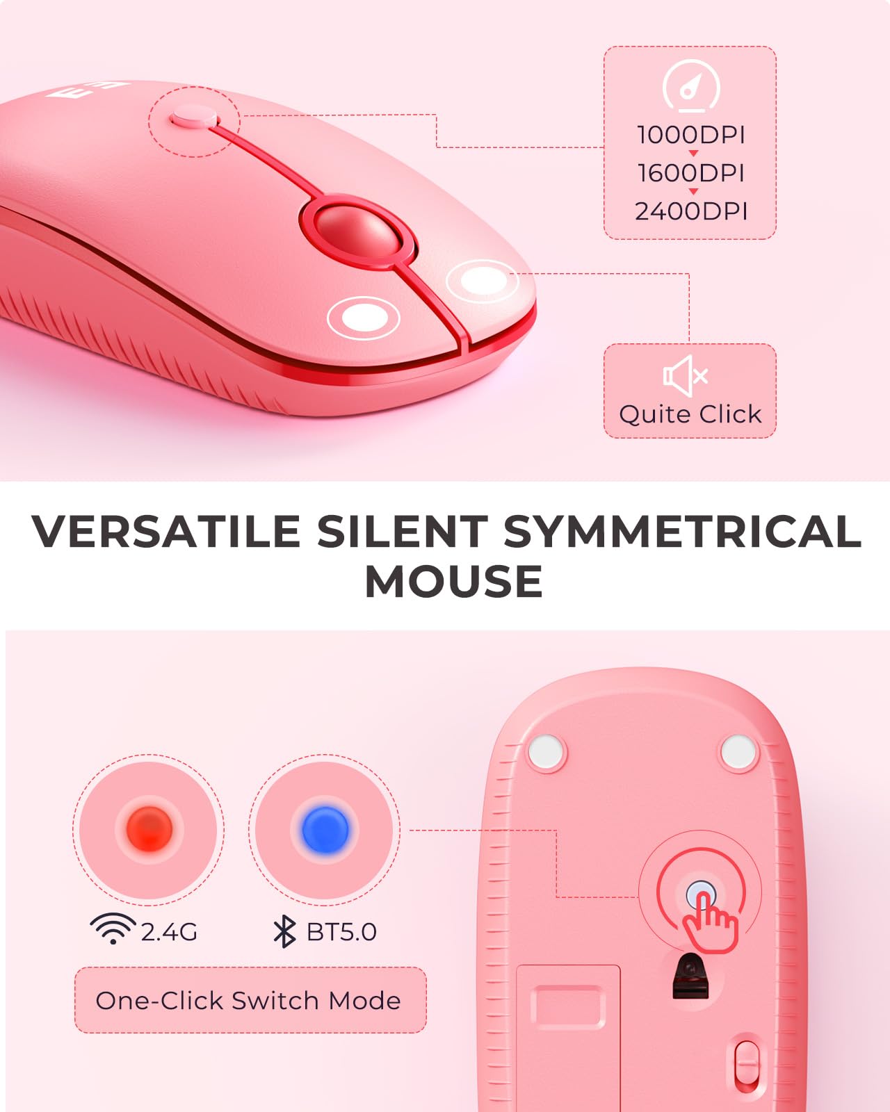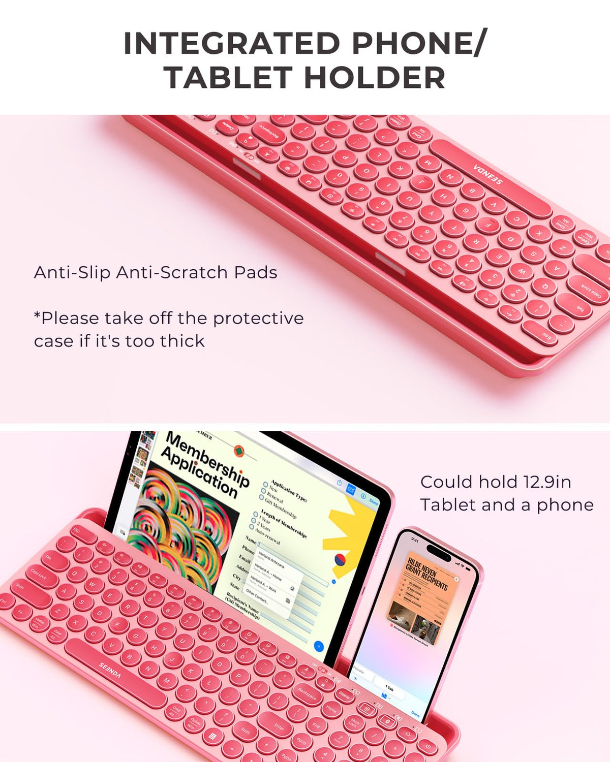 Seenda Bluetooth Keyboard And Mouse For Ipad, Multi Device Bluetooth + 2.4G Wireless Round Key Cute Keyboard Mouse With Tablet Holder For Macbook/Windows Computer, Ios/Andriod Tablet Phone Coral Pink