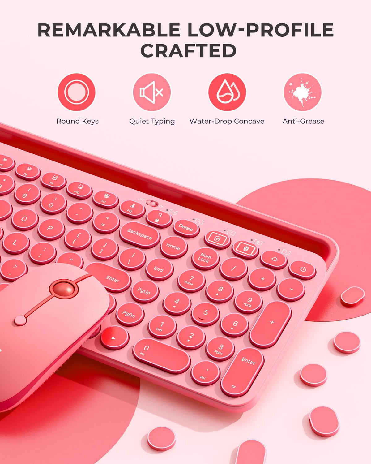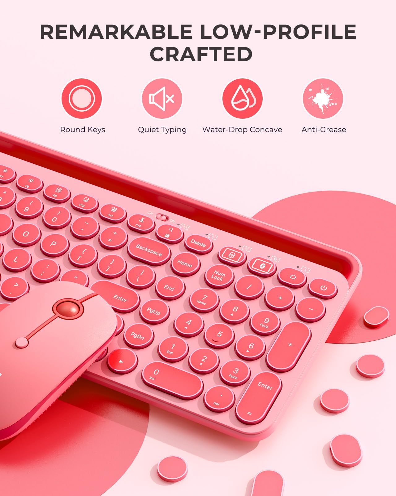 ? 2-In-1 2.4G Wireless Mode + Bluetooth Mode - Supports Dual Devices Simultaneously And Is Easy To Switch Between Them ? Works With Windows, Ios, Mac Os, Android - Compatible With Ipad, Ipad Pro, Ipad Mini, Ipad Air, Iphone, Samsung Tablets, Macbook, Macbook Pro, Chromebook, Windows Pc And More ? Typewriter Round Keys - Sensitive Responsive Ensures Quiet And Comfortable Typing, Offers Fluid, Satisfying Feedback With Every Tap ? Comfortable Touch Feeling With A Silicone Cover - The Cute Wireless Keyboard Comes With A Silicone Cover To Enhance Your Comfortable Typing Experience, As Well As Protect Your Aesthetic Keyboard From Dust And Any Coffee Accident ? Anti-Slip Pads At The Bottom Can Prevent The Keyboard From Sliding - The Sturdy Built Body Will Keep Your Devices Stable So They Won�T Knock Over ? Low Consumption - The Computer Keyboard Designs An Independent Power Switch To Turn On/Off The Keyboard For Saving Power. It Is Not Used For More Than 30Minutes, Will Automatically Go Into Sleep Mode To Save Energy And Press Any Key To Wake It Up.