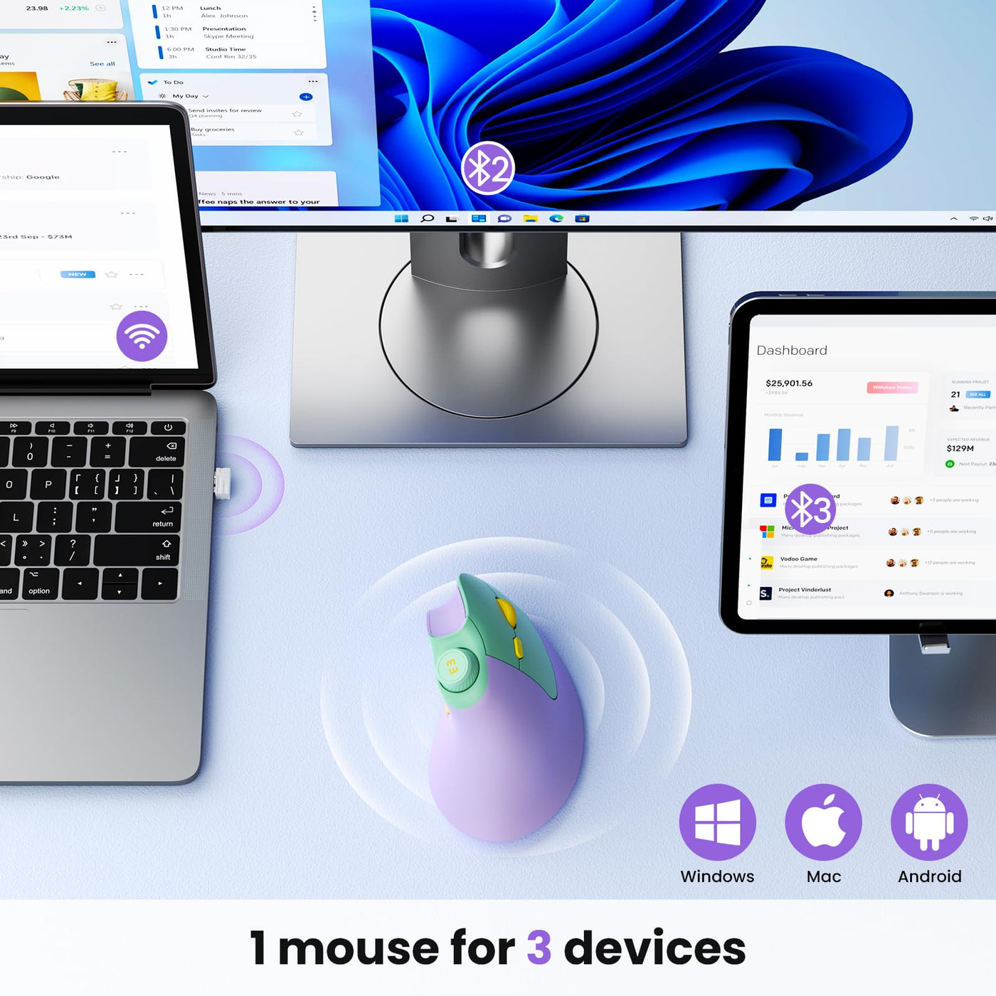 Seenda Ergonomic Mouse Rechargeable, Vertical Wireless Mouse With Volume Knob, Quiet Clicks, 3 Device Connection (Bluetooth Or Usb), Optical Mice For Windows, Pc/Mac Purple