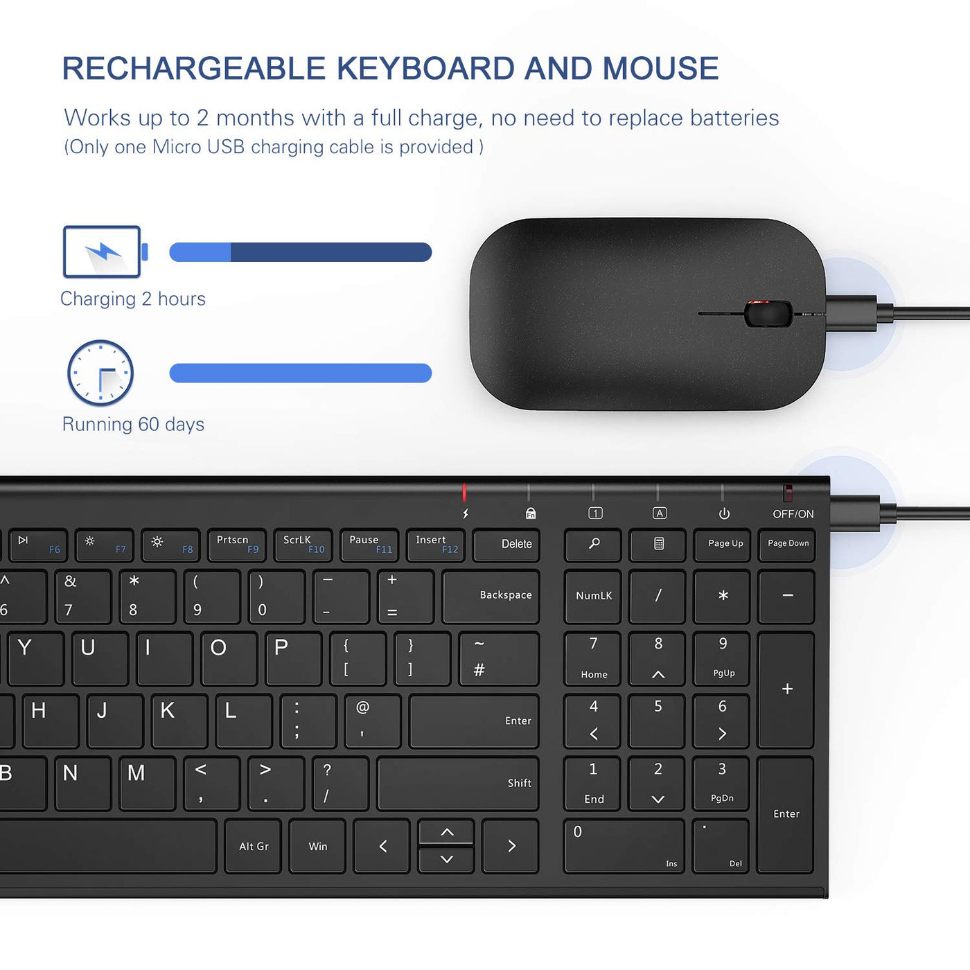 No Hassle To Replace Batteries With 280Mah Internal Rechargeable Batteries Of Both Keyboard And Mouse, You Can Use It Up To 2 Months With A Single Two Hours Charge.Auto Sleep Function Saves Your Power And Extend Your Battery Life