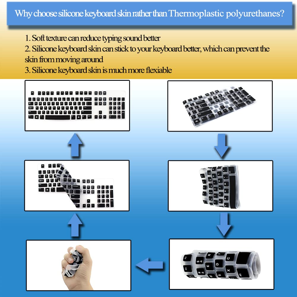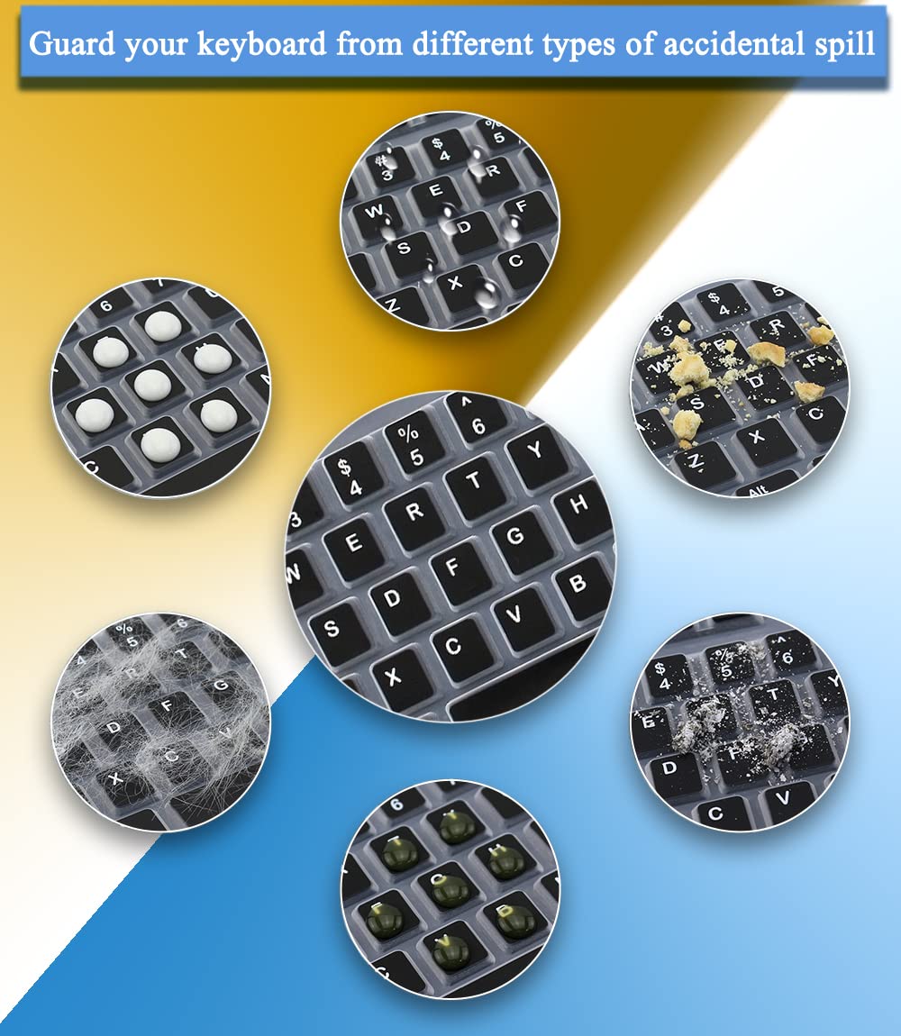 Q: How does the keyboard cover protect against spills and dust?A: The silicone keyboard cover acts as a waterproof barrier, protecting your keyboard from liquid spills like coffee or juice, as well as dust and crumbs, ensuring it stays clean and functional.