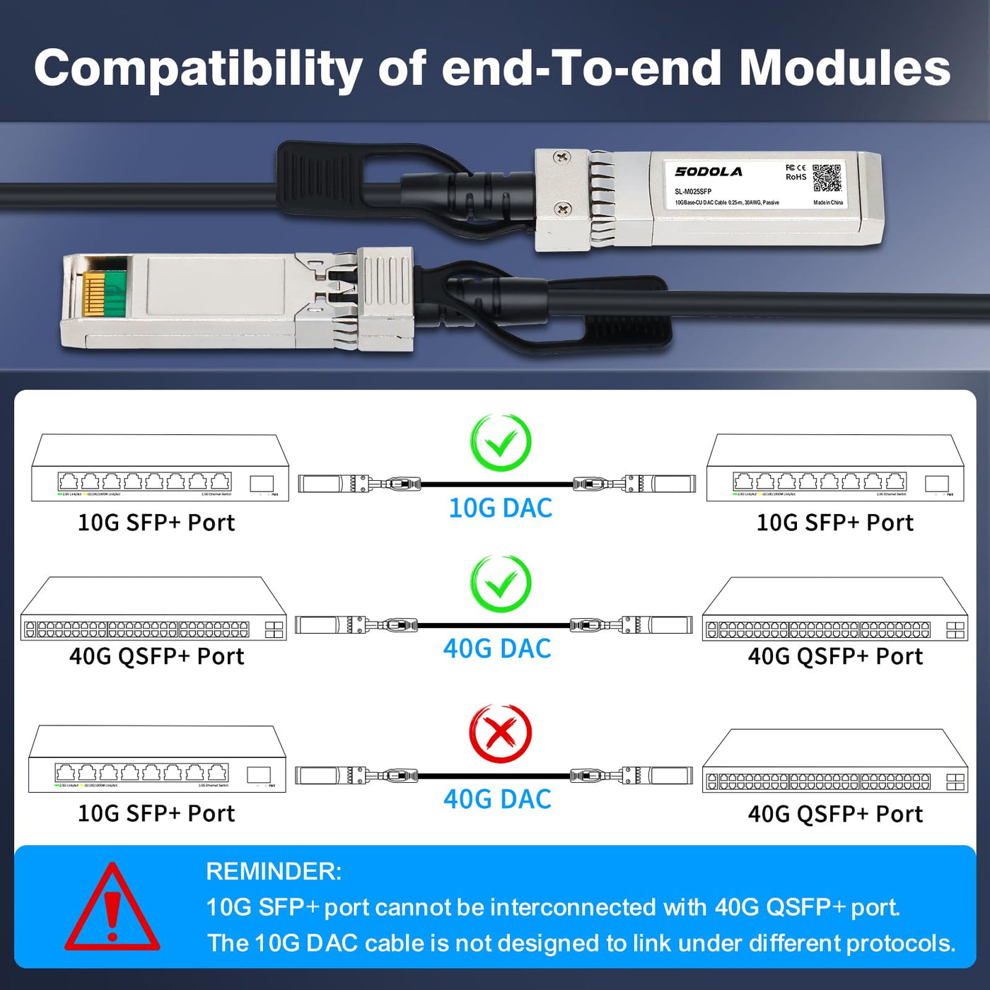 Q: Is the Sodola SFP+ DAC cable compatible with Cisco devices?A: Yes, the Sodola SFP+ DAC cable is compatible with a variety of devices including Cisco SFP-H10GB-CU0.25M, as well as other brands like Ubiquiti, TP-Link, and Netgear.