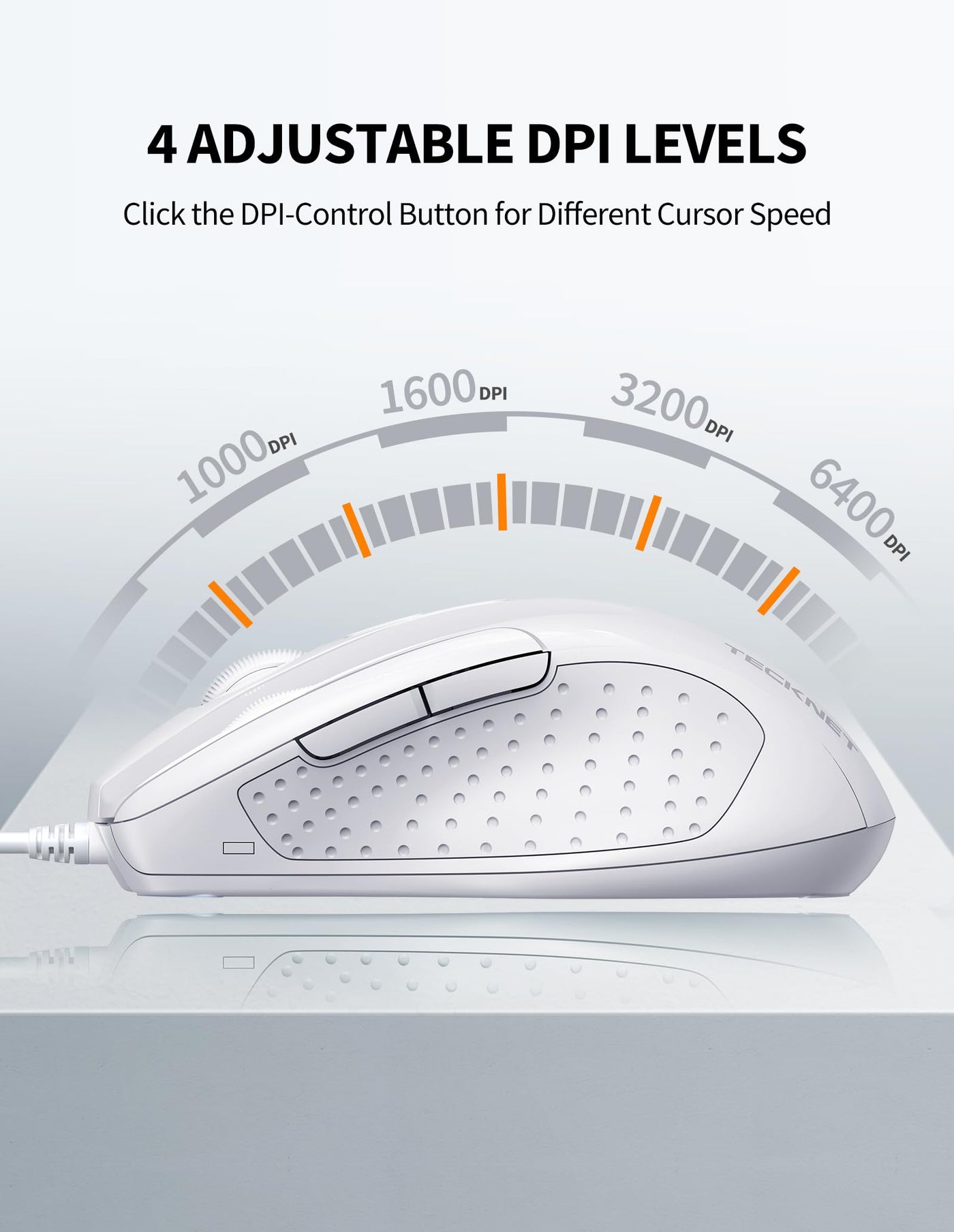 ?High Precision And Durability?: Tecknet Tru-Wave Technology Wired Computer Mouse Provides Precise, Intelligent Cursor Control And Tracking On Many Surface Types, Even On Smooth Surfaces With Glass. Tested For Over 6 Million Keystrokes, The Wired Mouse Ensures Responsive Clicks And A Longer Lifespan For Daily Use. | ?4 Adjustable Dpi And 6 Buttons?: 4-Level Dpi Settings(1000/1600/3200/6400) To Meet Your Needs Both In Home And Office. 6 Buttons Enable Superior Productivity And Efficiency To Meet All Your Computer Needs. Moving Quickly Between Documents Or Browsing Your Favorite Web Sites Is A Breeze With Large, Easy-To-Reach Back/Forward Buttons. | ?Ergonomic Design?: The Shaped Design And Soft Rubber Grips Conform To The Hand And Are Designed To Be Comfortable To Hold. The Compact Size Enables It To Be Able To Be Taken Wherever Desired For Use On The Computer Whether At Home, At Work Or Anywhere Else. | ?Plug And Play?: Simply Plug In The Usb Cable To Power Your Mouse, Eliminates The Trouble Of Replacing Batteries. No Software Or Downloads Required. The 5Ft Of Usb Cable Is The Perfect Length For A Usb Wired Mouse And Adapts To Almost Any Computer Setup With No Lag. | ?Wide Compatibility?:Compatible With Windows 11,10, 8, Xp, Vista And Chromebook, Mac (Side Buttons Not Work On Mac) | ?36 Months Support?: If You Encounter Any Problems In Using The Product, Please Feel Free To Contact Our Professional Customer Service Team, Enjoying Tecknet 36 Months Warranty (Registered Only)