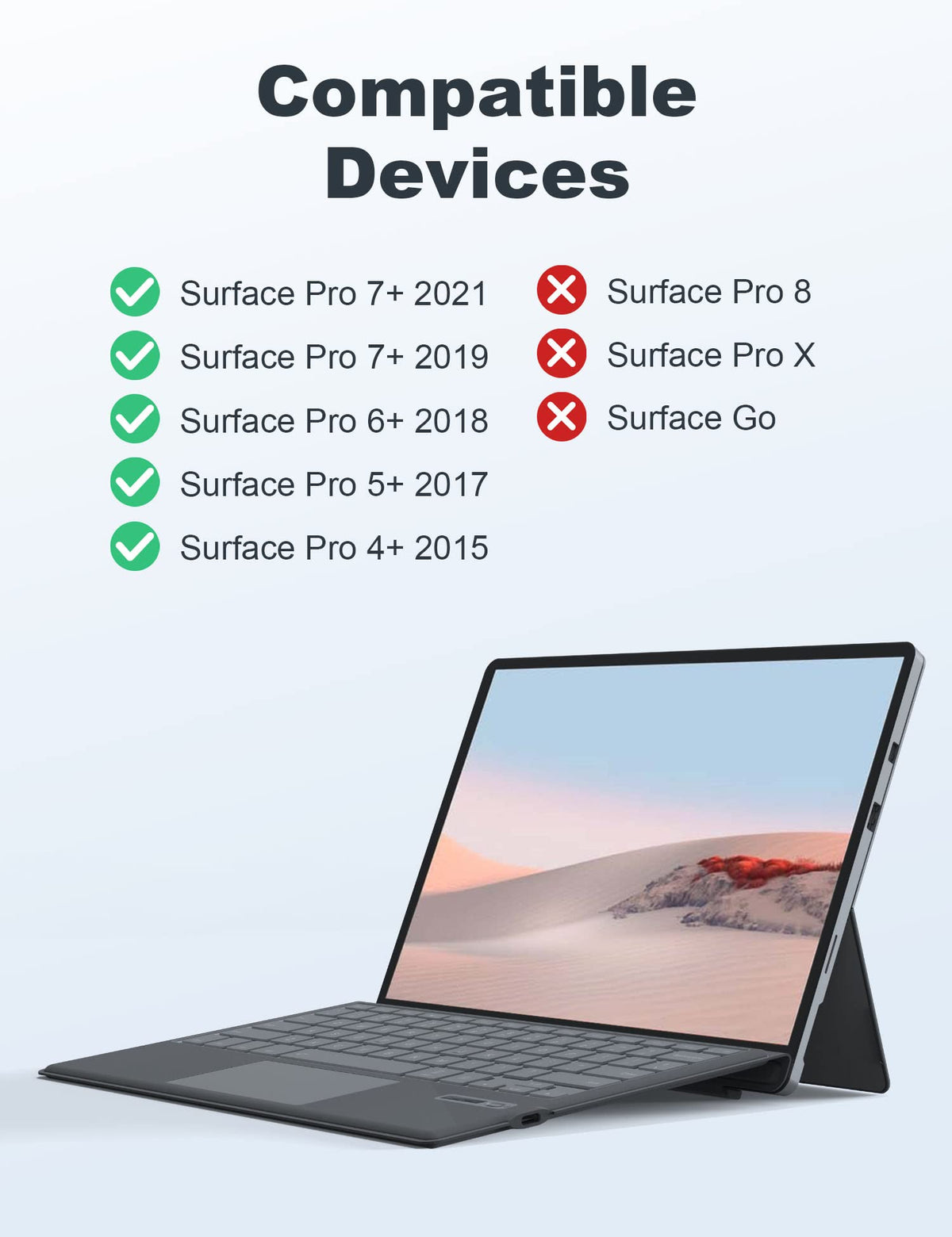 Q: Is the TOMSENN Surface Pro 7 Keyboard compatible with other Surface Pro models?A: Yes, the TOMSENN Surface Pro 7 Keyboard is compatible with Surface Pro models 7, 7+, 6, 5, 4, and 3, providing a versatile typing solution for various devices.
