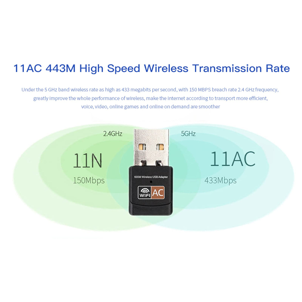 Q: What is the maximum speed of the USB Wifi Adapter?A: The USB Wifi Adapter supports a maximum speed of up to 600Mbps, with 433Mbps on the 5GHz band and 150Mbps on the 2.4GHz band, making it ideal for online gaming and HD video streaming.