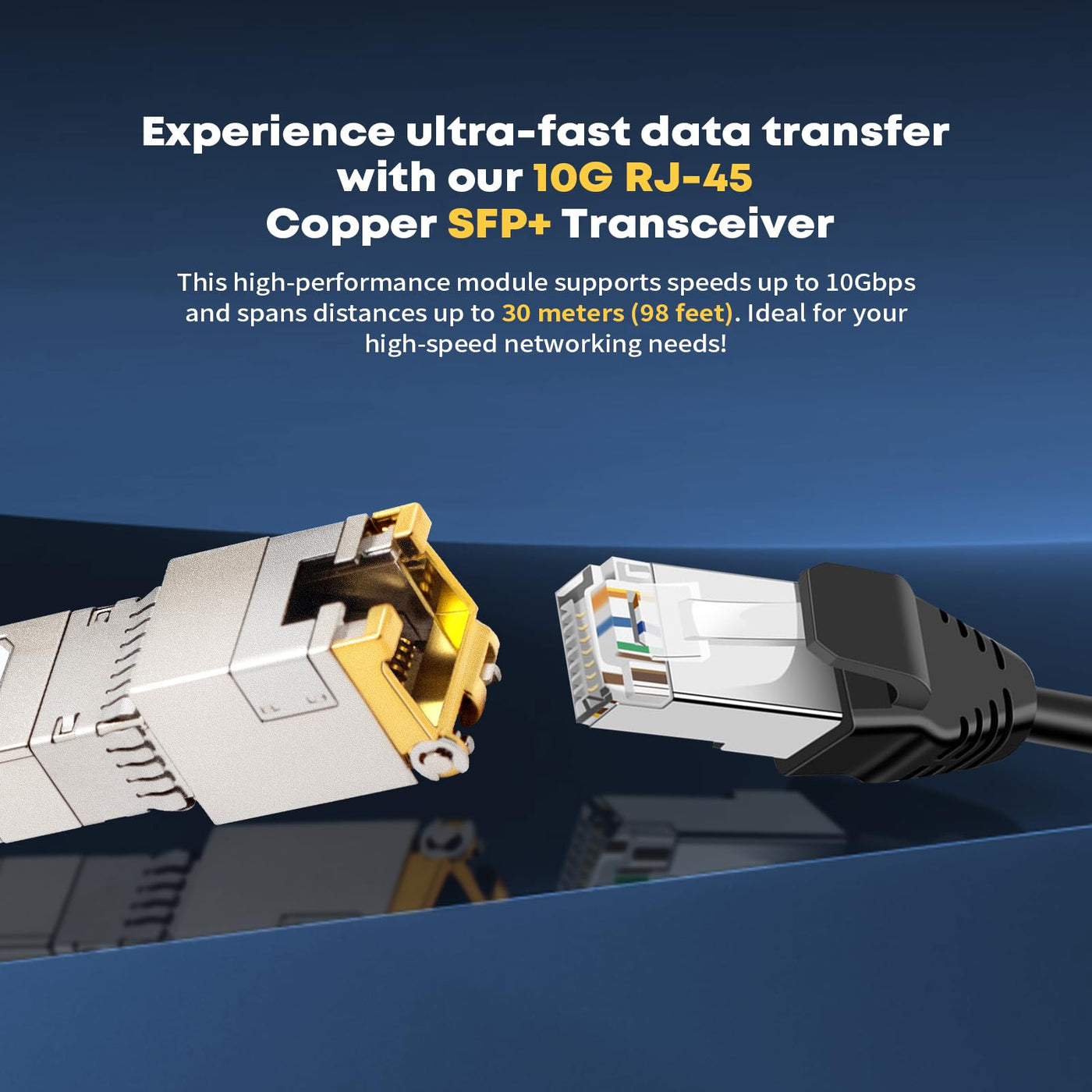 Product Description 10G-Sfp-T Copper Transceiver Module For 10 Gigabit Ethernet The 10G-Sfp-T Copper Transceiver Module Is A High-Performance Networking Solution Designed To Enable 10 Gigabit Ethernet Over Cat 6A/7 Copper Cables. It Provides A Reliable And Cost-Effective Way To Upgrade Existing Network Infrastructures To Support High-Speed Data Transmission. Key Features: High-Speed Data Transfer: Achieve 10 Gb/S Communication Over Cat 6A Or Cat 7 Cables, Perfect For Demanding Network Environments. Long-Distance Capability: Supports Cable Lengths Up To 30 Meters, Making It Ideal For A Range Of Short-Distance Networking Applications. Industry Standards Compliant: Sff-8431 And Sff-8432 Msa: Ensures Compatibility And Interoperability With Various Network Devices. Ieee 802.3Az: Energy-Efficient Design Helps Reduce Power Consumption. Low Power Consumption: Consumes A Maximum Of 2.5 Watts At 30 Meters, Providing Energy Savings Without Compromising Performance. Advanced Performance Features: Fast Retrain Emi Cancellation: Reduces Electromagnetic Interference For A Stable Connection. Low Emi Emissions: Minimizes Interference With Other Electronic Devices. Easy Integration: Auto-Negotiation: Automatically Adjusts To Optimal Speed And Settings When Connected To Other 10Gbase-T Devices. Mdi/Mdix Crossover: Automatically Corrects For Crossover Cables, Simplifying Installation. Comprehensive Testing And Diagnostics: Multiple Loopback Modes: Simplifies Testing And Troubleshooting. Built-In Cable Monitoring: Provides Real-Time Diagnostics Including Cable Length Measurements And Detection Of Opens/Shorts. Durable Design: Robust Die Cast Housing: Ensures Long-Lasting Durability. Bail Latch Style Ejector: Allows Easy Installation And Removal. Versatile Cable Support: Compatible With Both Unshielded And Shielded Cables, Offering Flexibility For Various Networking Setups. Enhance Your Network With Ease: Upgrade Your Network Effortlessly With The 10G-Sfp-T Transceiver Module, And Enjoy The Benefits Of High-Speed, Reliable Data Transfer.
