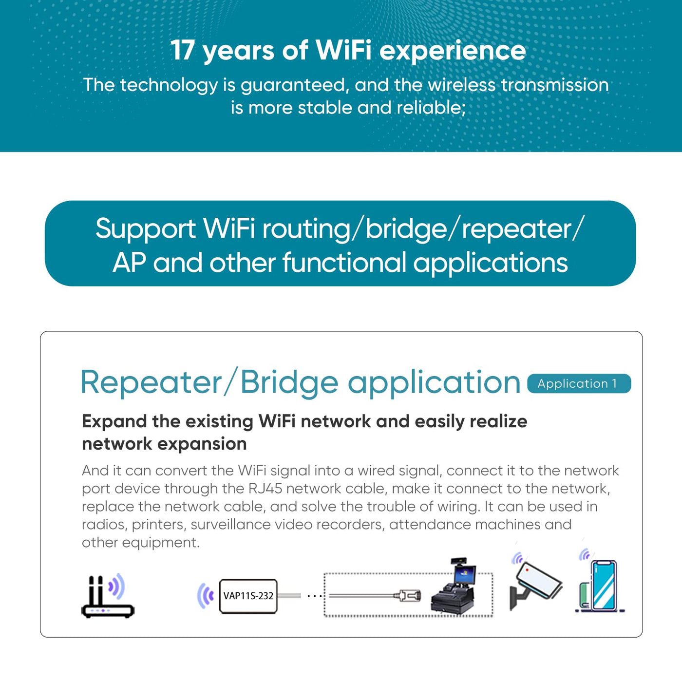 Q: How does the VONETS VAP11S-232 ensure stable WiFi connections?A: The VONETS VAP11S-232 utilizes temperature compensated auto frequency control technology (TAFC) to maintain stable WiFi signals and reduce dropouts. Additionally, it supports multiple WiFi security protocols, ensuring a secure and reliable connection.
