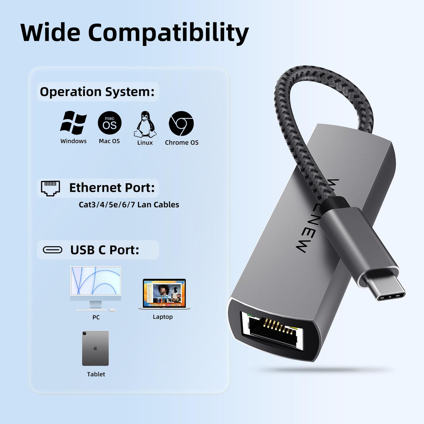 Q: What devices are compatible with the WALNEW USB-C 2.5Gb Ethernet Adapter?A: The WALNEW USB-C 2.5Gb Ethernet Adapter is compatible with a wide range of devices that have USB-C or Thunderbolt 3/4 ports. This includes MacBook Pro/Air, iMac, Dell XPS series, Microsoft Surface devices, and various tablets such as the iPad Pro and Galaxy Tab series.