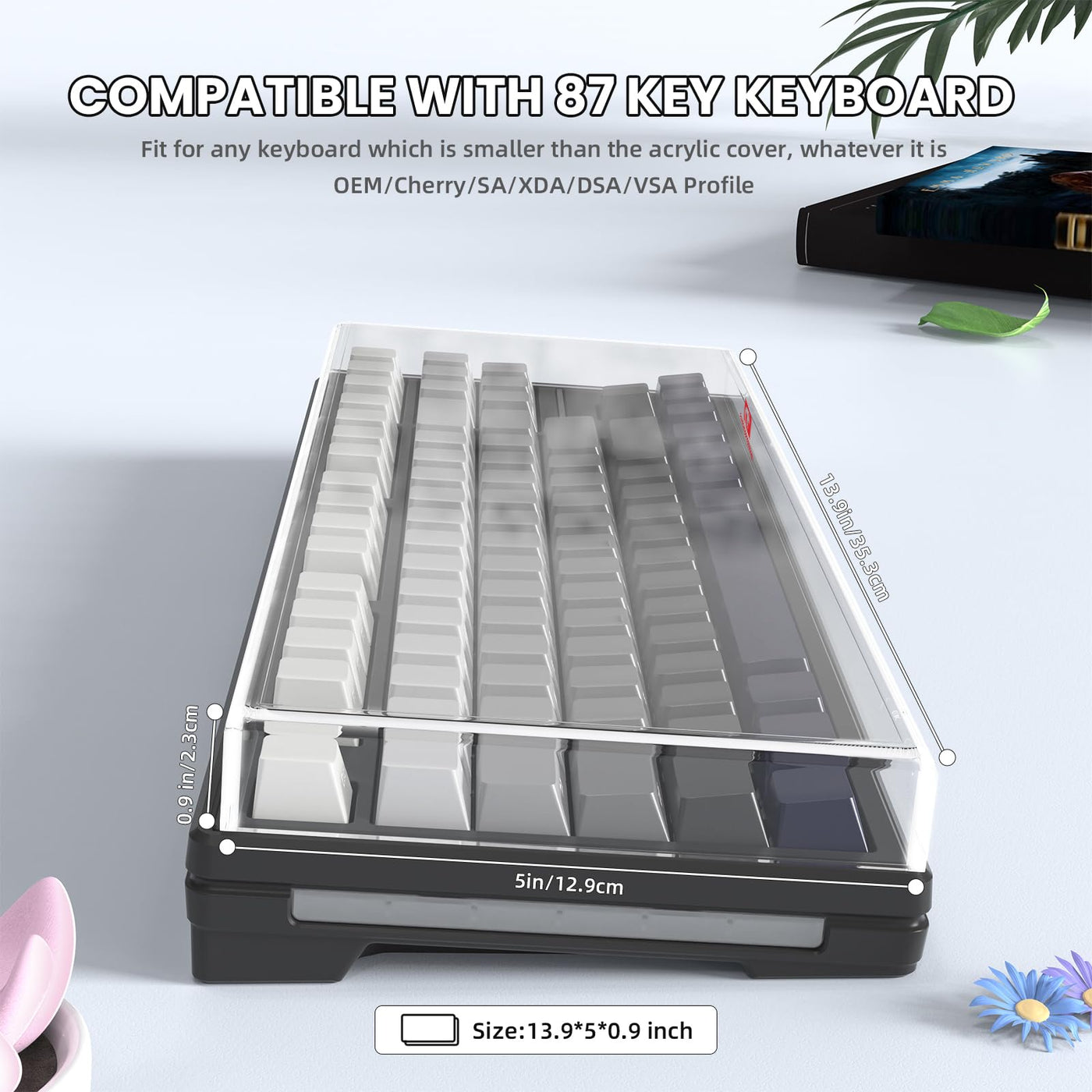 Q: What keyboards are compatible with the ZIYOU LANG KC03 Acrylic Keyboard Cover?A: The ZIYOU LANG KC03 Acrylic Keyboard Cover is designed to fit 75% small layout keyboards, including 82-key, 84-key, and 87-key mechanical and membrane keyboards that are smaller than the dimensions of 13.9*5*0.9 inches.