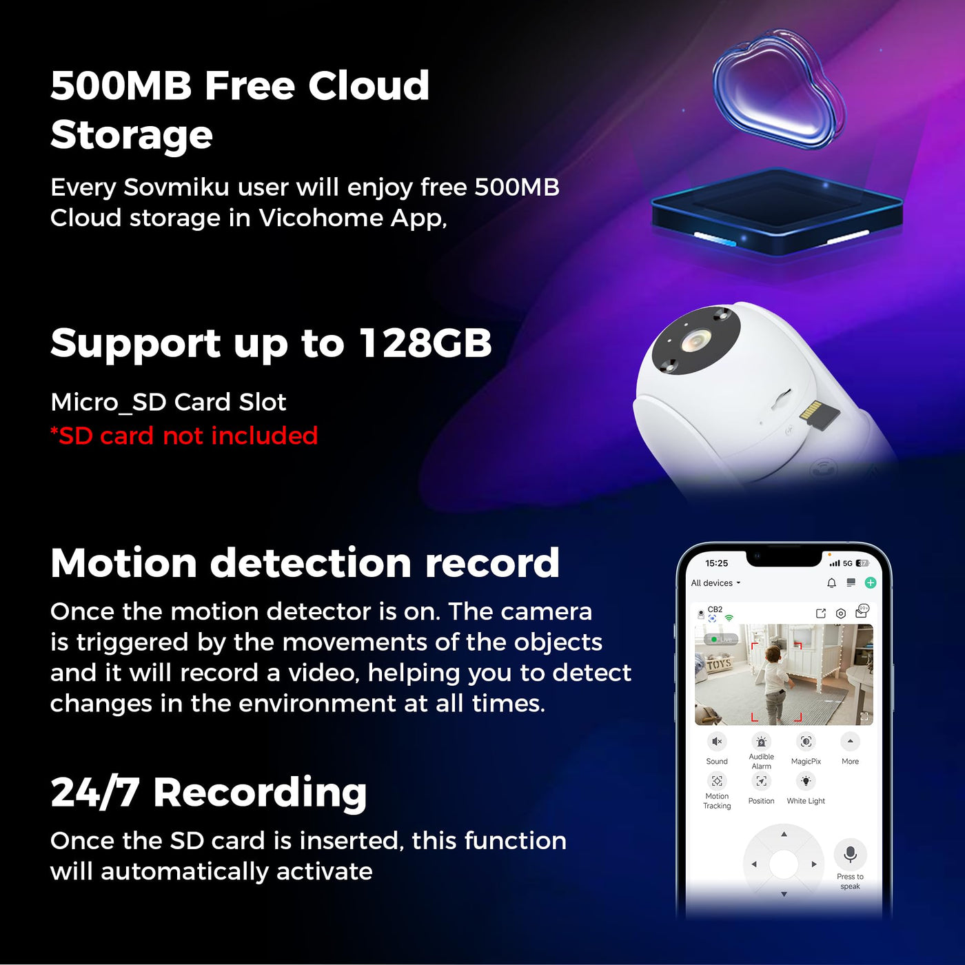 Sovmiku 3Cb2 2K Ai Surveillance Camera For Home, 500Mb Free Cloud Storage, Starlight Color Night Vision, Easy To Setup, User Friendly, Audible Flashlight Alarm,2.4Ghz Wi-Fi,Sd Slot,Vicohome App No Battery Required, The Product Does Not Contain Any Battery Components