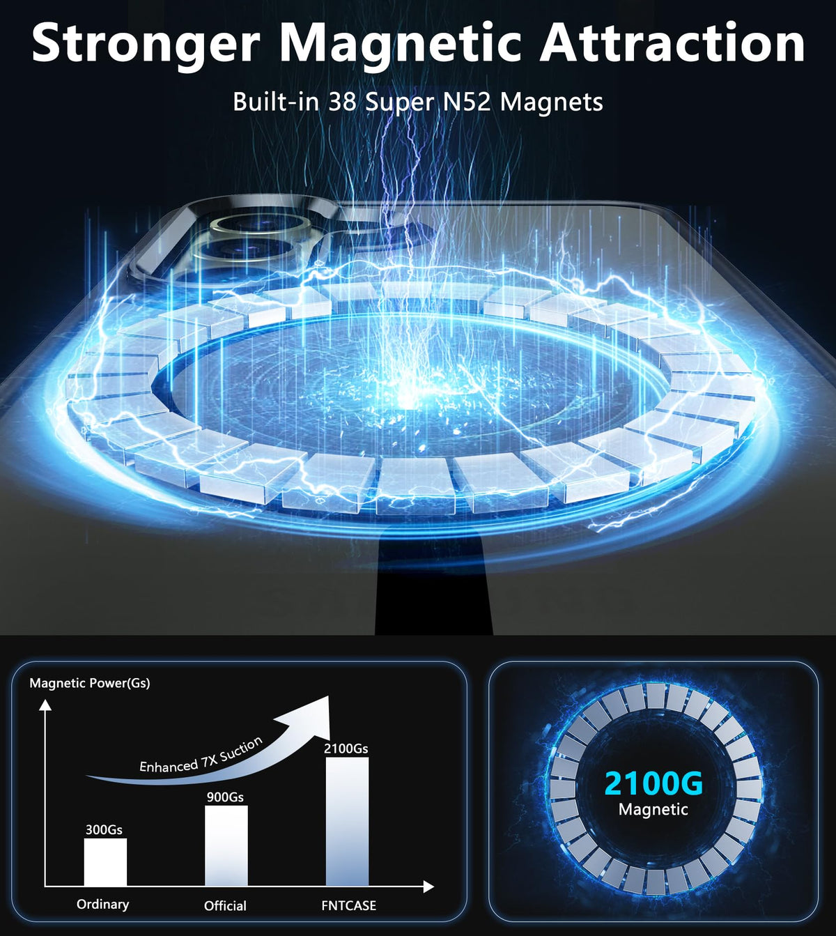 Q: Does the case support wireless charging?A: Yes, the FNTCASE features strong built-in N52 magnets that allow for easy attachment of various magnetic charging accessories, including wireless chargers.