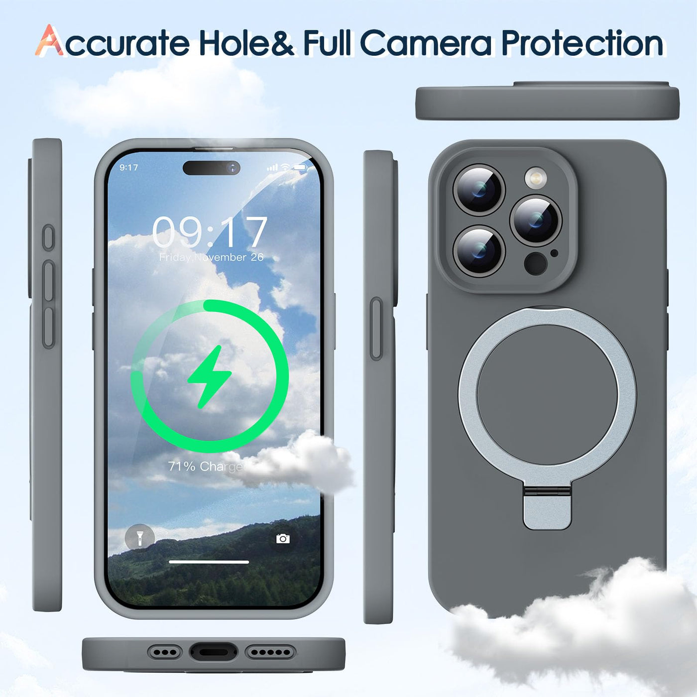Q: What materials are used in the KMAMBAG Mag-Ring case?A: The case is made from moisturizing factor liquid silicone, featuring an aluminum magnetic ring and a microfiber lining, providing a soft touch and excellent grip.