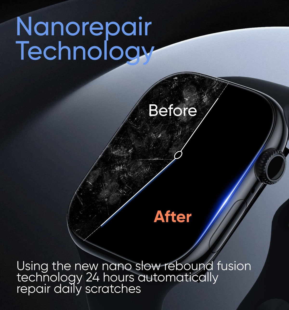 Q: How does the self-healing feature of the screen protector work?A: The self-healing feature of the MAGIC JOHN screen protector allows minor scratches and bubbles to disappear automatically within 24 hours, ensuring that your Apple Watch screen remains clear and undamaged.