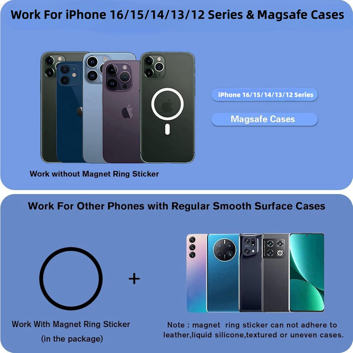 Q: Is the AUROX Magnetic Base compatible with all iPhone models?A: The AUROX Magnetic Base is specifically designed for iPhone 15, 14, 13, and 12 series. For other models, a magnet sticker is included in the package to ensure compatibility with MagSafe functionality.