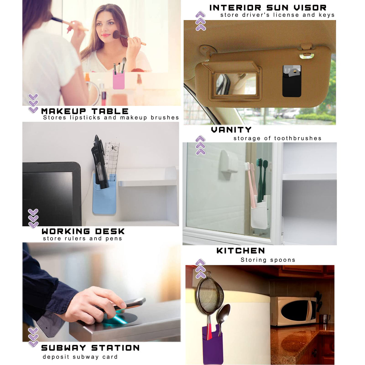 Q: What are some alternative uses for the Meroqeel Card Holder?A: In addition to storing cards, the Meroqeel Card Holder can be used for various purposes around the home or office. You can stick it to kitchen walls to store cutlery, to desks for pens and rulers, or to mirrors for makeup brushes, making it a versatile organizational tool.