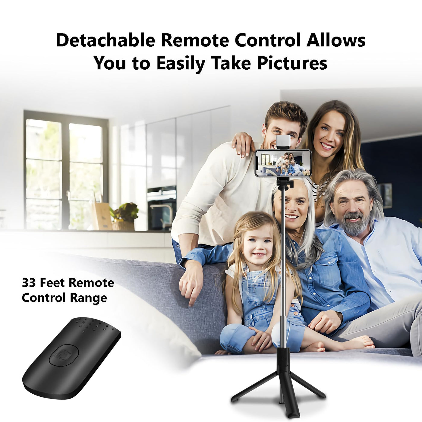 Q: How does the wireless remote control work?A: The detachable wireless remote control allows you to take photos easily by pressing the button on the handle. It has a control distance of up to 33 feet, suitable for both iOS and Android smartphones.