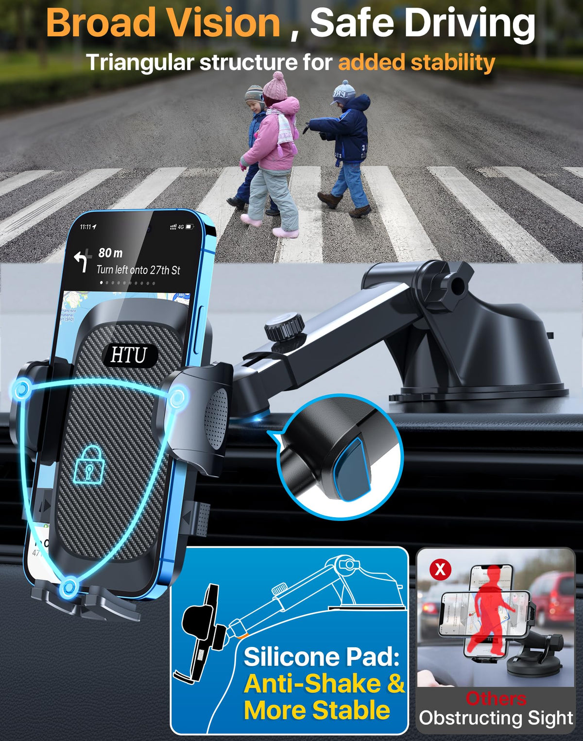Htu 2024 Upgrade Smart Car Phone Holder: 1. 3 In 1 Car Phone Holder: This Phone Car Holder Is Suitable For Car Dashboard, Windshield Or Air Vents; 2. Reinforced Suction Cups: Stable Bottom Glue Fix And Super Sticky Suction Cups To Prevent Falling; 3. Perfect Protection: Silicone Arms With Shock Absorption, Silicone Pad Back And Silicone Pads, Can Be Fixed On Car Phone Holder To Grab And Protect The Phone; 4. Simple And Fast Installation: No Tools Required. Just Press One Button To Release Your Phone, One Firm Press Locks Your Phone On The Stand;5. Flexible 360 Ball Joint And Adjustable Telescopic Arm Allow You To Hold Your Phone Adjust To Any Angle And Position, And Switch Quickly Between Vertical And Horizontal Viewing Angles. Important: 1. If The Surface Is Dirty Or Sticky, Wash The Suction Cup Of The Car Mount With Warm Water, Then Air Dry; 2. In The Cold In The Environment, Please Use A Ventilator Or Warm Water To Heat The Suction Cup; 3. Do Not Stick The Bracket To The Dashboard Or Windshield For A Long Time. You Can Reattach The Stand Before Your Next Trip;4. After Removing The Phone Stand, Please Use A Plastic Wrap To Protect The Suction Cup. Please Clean The Dashboard Before Using The Car Bracket, And Clean The Car Bracket And Air Dry It; 5. If Your Car Is Exposed To High Temperature For A Long Time, We Recommend You To Use A Ventilated Car Bracket.