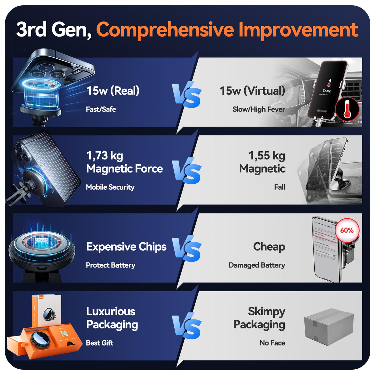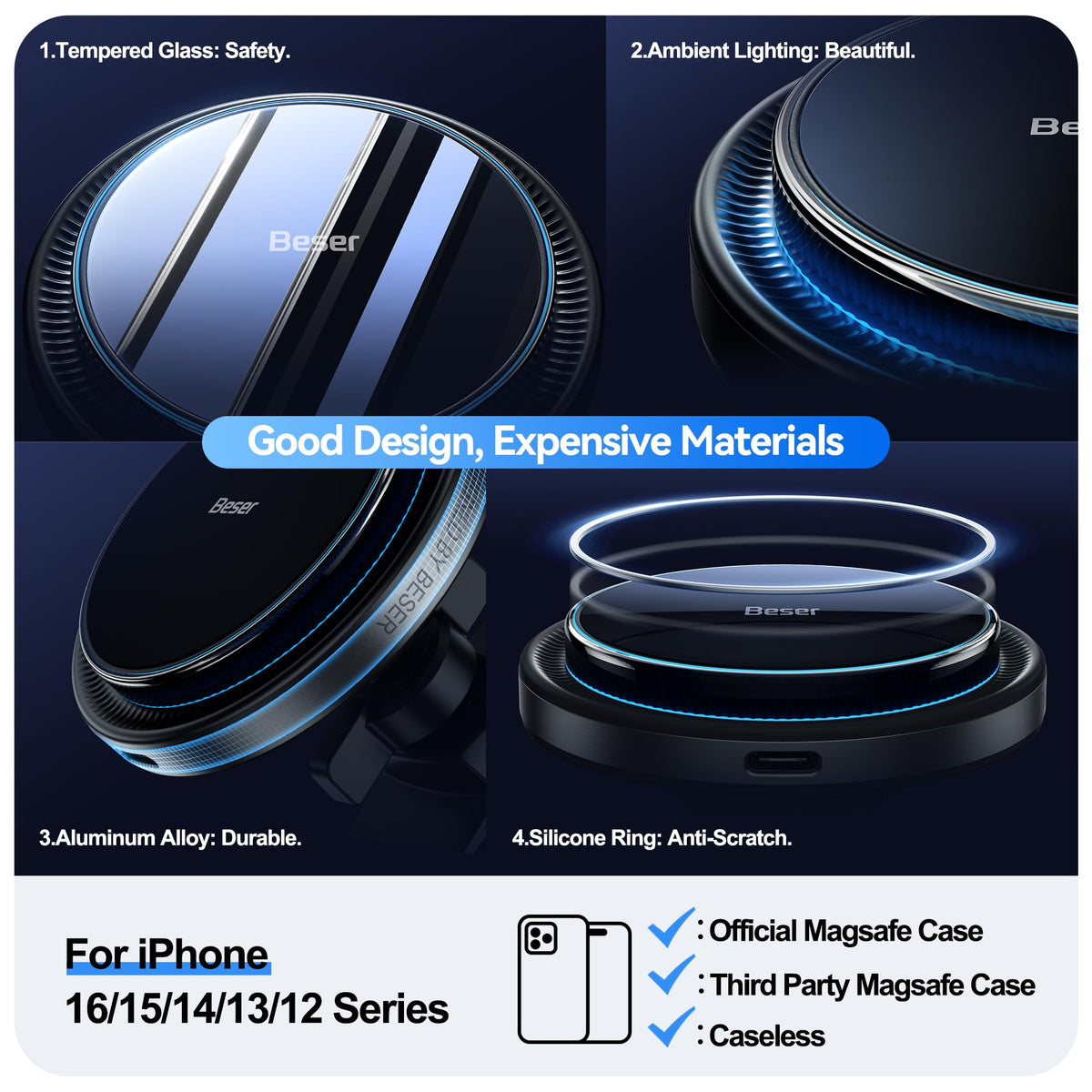 Beser 15W For Magsafe Car Mount Charger, (3.81 Lbf) Magnetic Qi Wireless Car Charger, Vent/Dashboard, Phone Holder Mount For Iphone 16/15/14/13/12 Series, Fast Charging, Aluminium Black Main Materials: Silicone + Plastic + Aluminum Alloy + Tempered Glassproduct Net Weight: 84.6Gproduct Weight: 260Gproduct Size: 7.2*7.2*3.5Cmsize Packaging: 17.5*10.2*4.5 Cmoperating Frequency: 110~205Khzconversion Efficiency: =75%Package Contains: ?1*Magsafe Car Mount Charger? ?1*Olecranon Clip+3M? ?1 * Type C Charging Cable (1M)? ?1 * Instruction Manual?