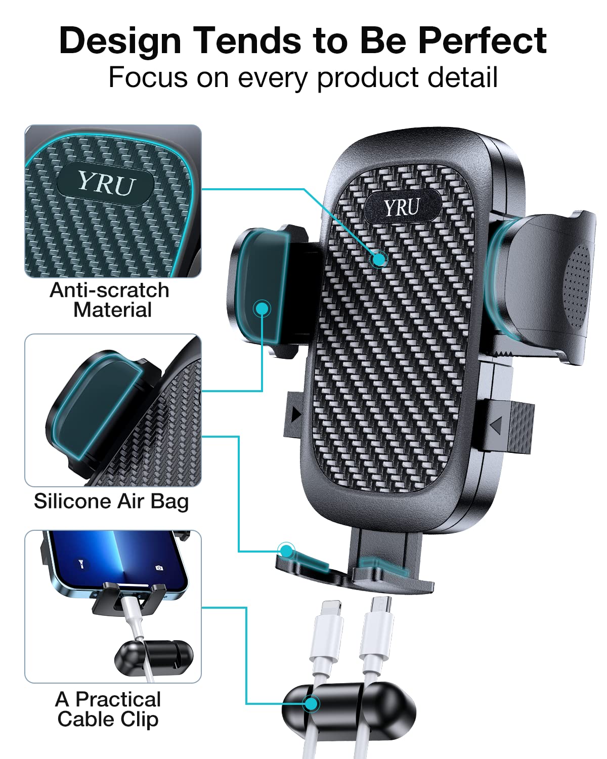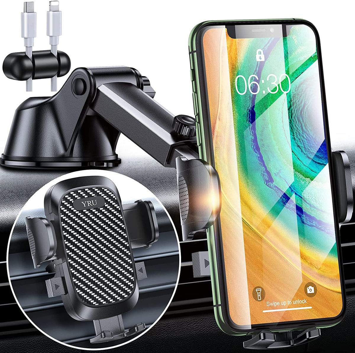 Q: What safety features does this car phone holder offer?A: The car phone holder is military-grade certified, ensuring high standards of stability, security, and durability. It also includes features like a patented 2-button design for easy operation and a built-in cable manager to keep cords tidy, enhancing safety while driving.