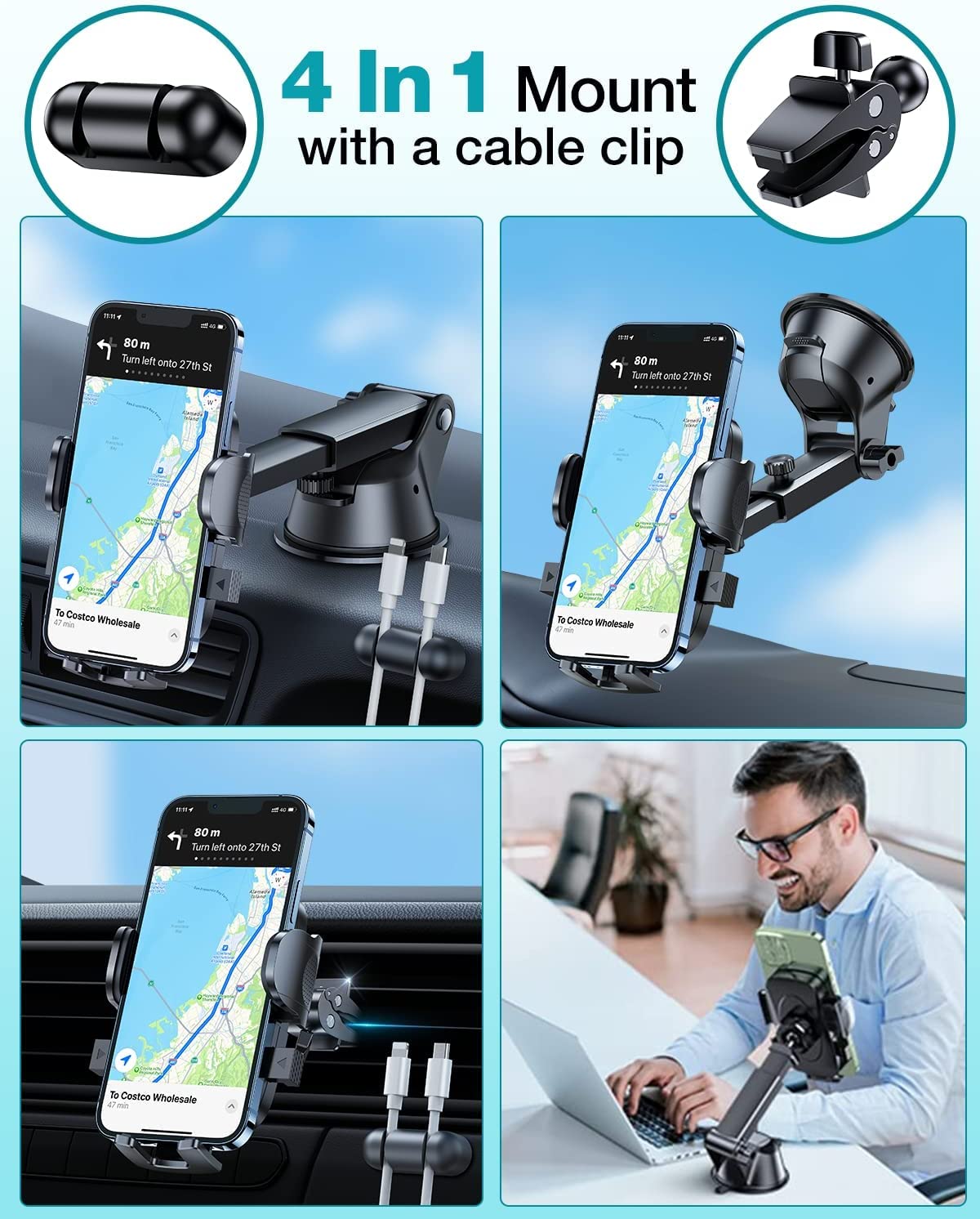 Q: Is this car phone holder compatible with all smartphone models?A: Yes, the car phone holder is designed to accommodate a wide range of smartphones, including the iPhone 15 Pro Max, iPhone 14, and Samsung models. The adjustable clamp arm can expand from 2.4 inches to 4.6 inches, making it universally compatible with various phone sizes.