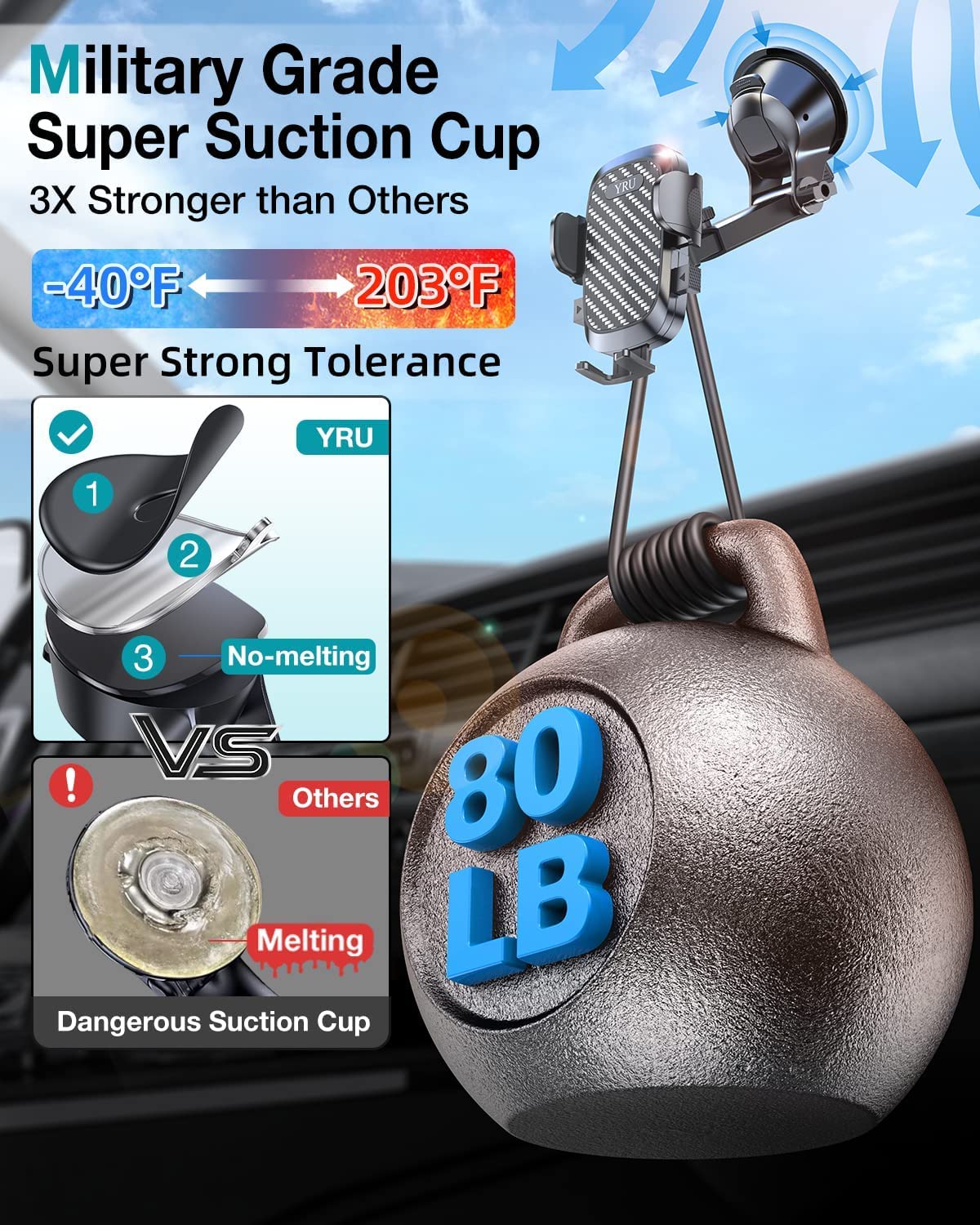 Q: How strong is the suction power of this phone mount?A: The phone mount features an upgraded suction base with an impressive 80LBS suction force. This ensures a secure hold on smooth surfaces, making it suitable for dashboards, windshields, and other flat areas even under extreme conditions.