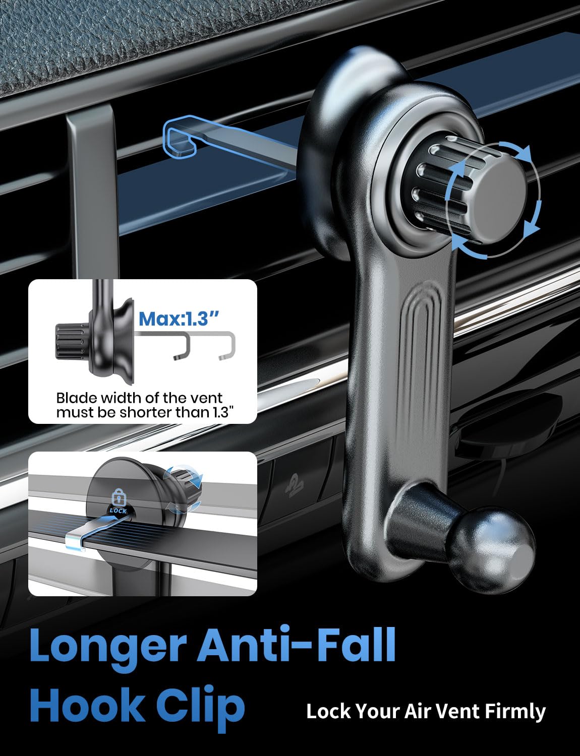 Q: How can I ensure my phone stays secure in the mount while driving?A: The eSamcore Car Vent Phone Mount features an upgraded design with an anti-fall mechanism and a larger clamp that securely holds devices up to 0.8" thick. This ensures stability, even on bumpy roads, preventing your phone from falling out.