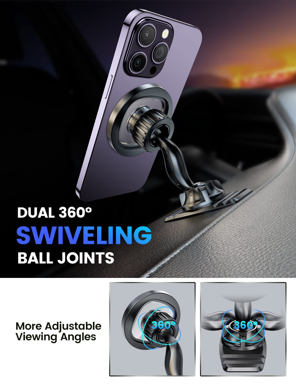 1. This Dashboard Phone Holder Was Designed For Iphone 14 Iphone 12, Iphone 13 Series Smartphone And Magsafe Magnetic Case. 2. With 2 Extra Magsafe Metal Rings, Our Esamcore Magnetic Phone Mount Is Also Working For Other Smart Phones. 3. Using This Magnetic Car Phone Holder Never Block Your Magsafe Wireless Charging Or Other Regular Wireless Charging. 4. Circular Layout 8 Powerful N52 Magnets Create A Greater Attraction Force To Hold Your Iphone 14/ 13/ 12 Or Other Large Smartphone. 5. Double 360Rotating Ball Joints Allow Esamcore Car Phone Holder Mount To Be Adjusted To Any Optimal Viewing Angle Easily 6. The Bigger Adhesive Base With Flex Tabs Can Be Stuck On Slightly Curved Or Rough Surfaces Of Your Dashboard.