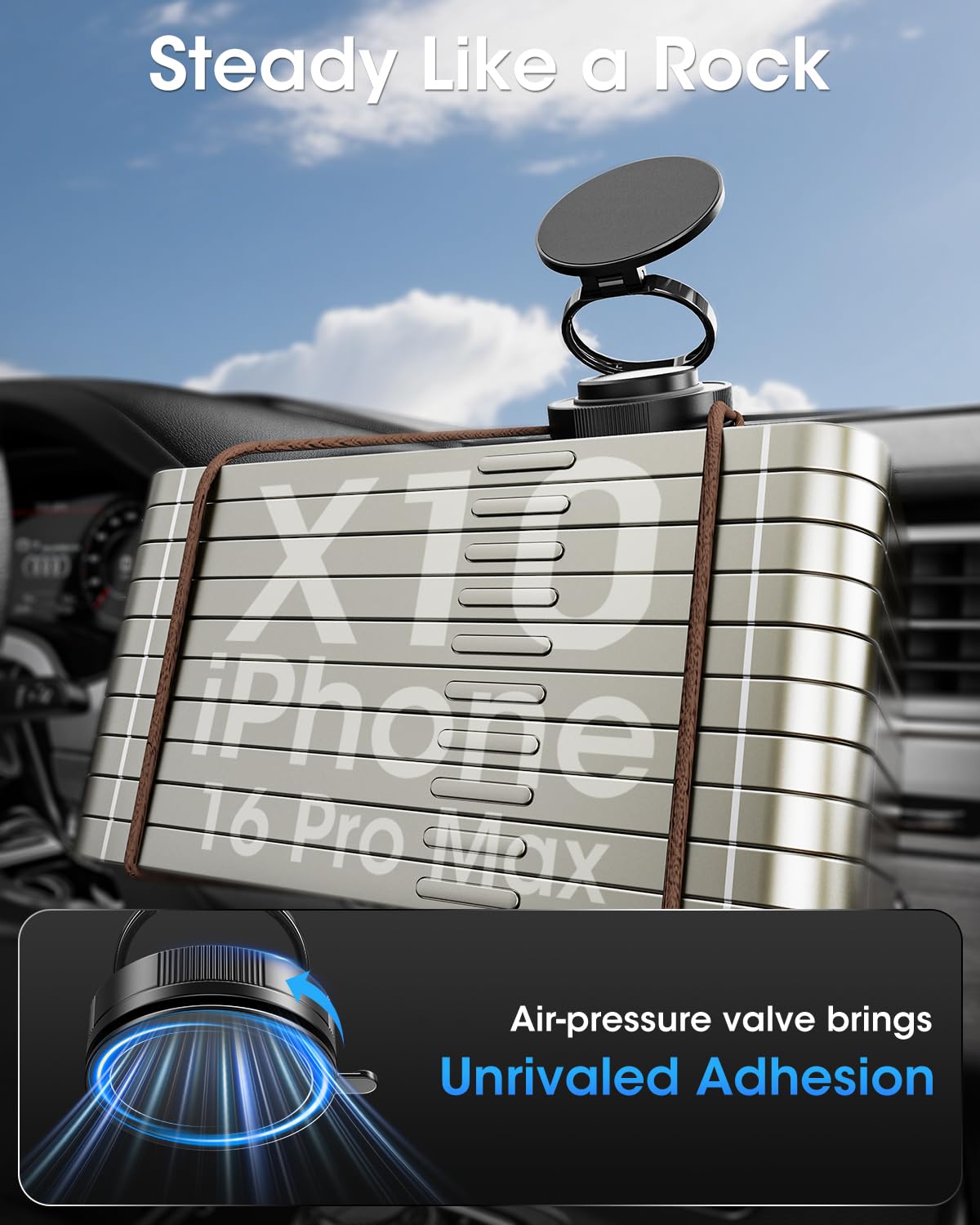This Ultra-Flexible Car Phone Holder Features A 360 Rotating Base And 180 Folding Zinc Alloy Arms For Effortless Angle Adjustments In Portrait Or Landscape Mode-Ideal For Cars, Offices, Or On-The-Go Use. Its Compact Folding Design Saves Space When Stored. The Advanced Rotating-Lock Vacuum Suction Provides 50% Stronger Grip Than Traditional Mounts, With A High-Strength Silicone Cup That Maintains Suction After Cleaning For Long-Term Stability. Equipped With Ultra-Strong N55 Magnets (2X Stronger Than Standard), It Securely Holds Phones Even On Bumpy Roads Without Interfering With Signals. Easy To Install On Any Smooth Surface (Dashboards, Mirrors, Screens) With One-Handed Operation, It Works With Bare Or Cased Phones. Compatible With Iphone 16/15/14/13/12, Magsafe Devices, And Non-Magsafe Phones (Includes Magnetic Ring), Ensuring Universal Fit For All Vehicles. Perfect For Driving, Workouts, Cooking, Streaming, And More!