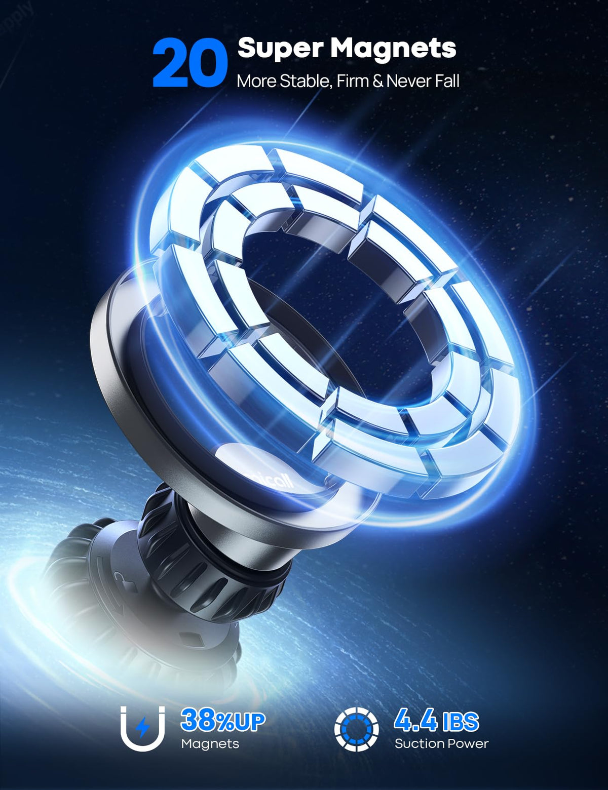 Q: How strong are the magnets in the Lamicall car mount?A: The Lamicall car mount features 20 upgraded N52 super magnets, providing a powerful hold of up to 4.4 lbs. This ensures that your phone stays securely in place even during sharp turns or bumpy rides.