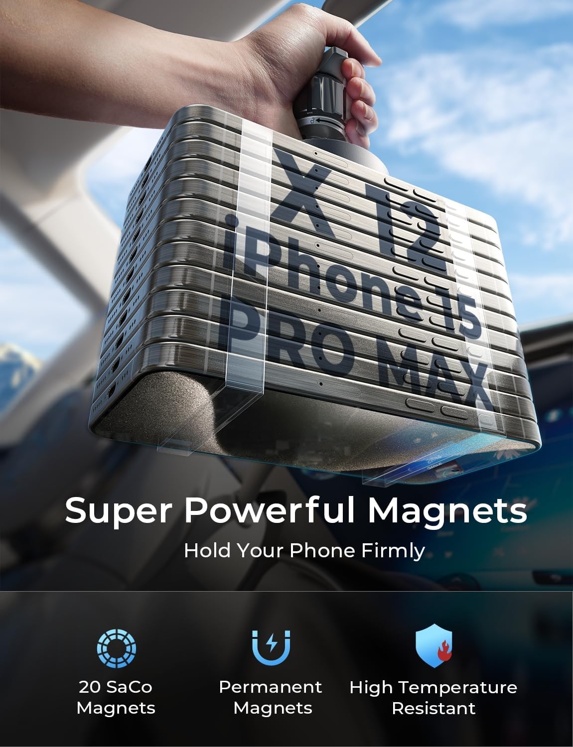 Q: How does the magnetic holding mechanism work on the LISEN car charger?A: The charger features 20 permanent magnets that provide superior magnetic strength, ensuring your phone stays securely attached even on bumpy roads, without the risk of it falling off.