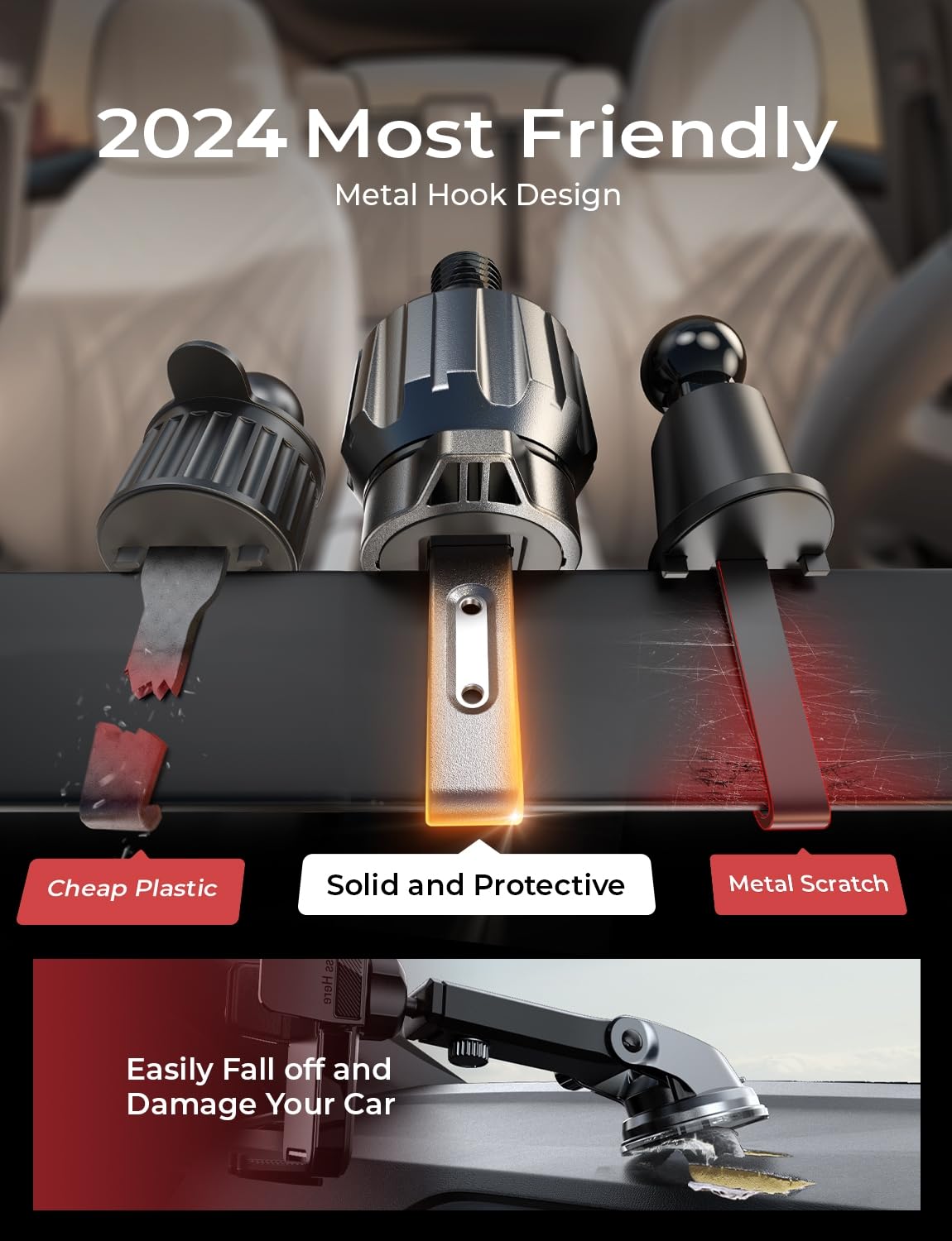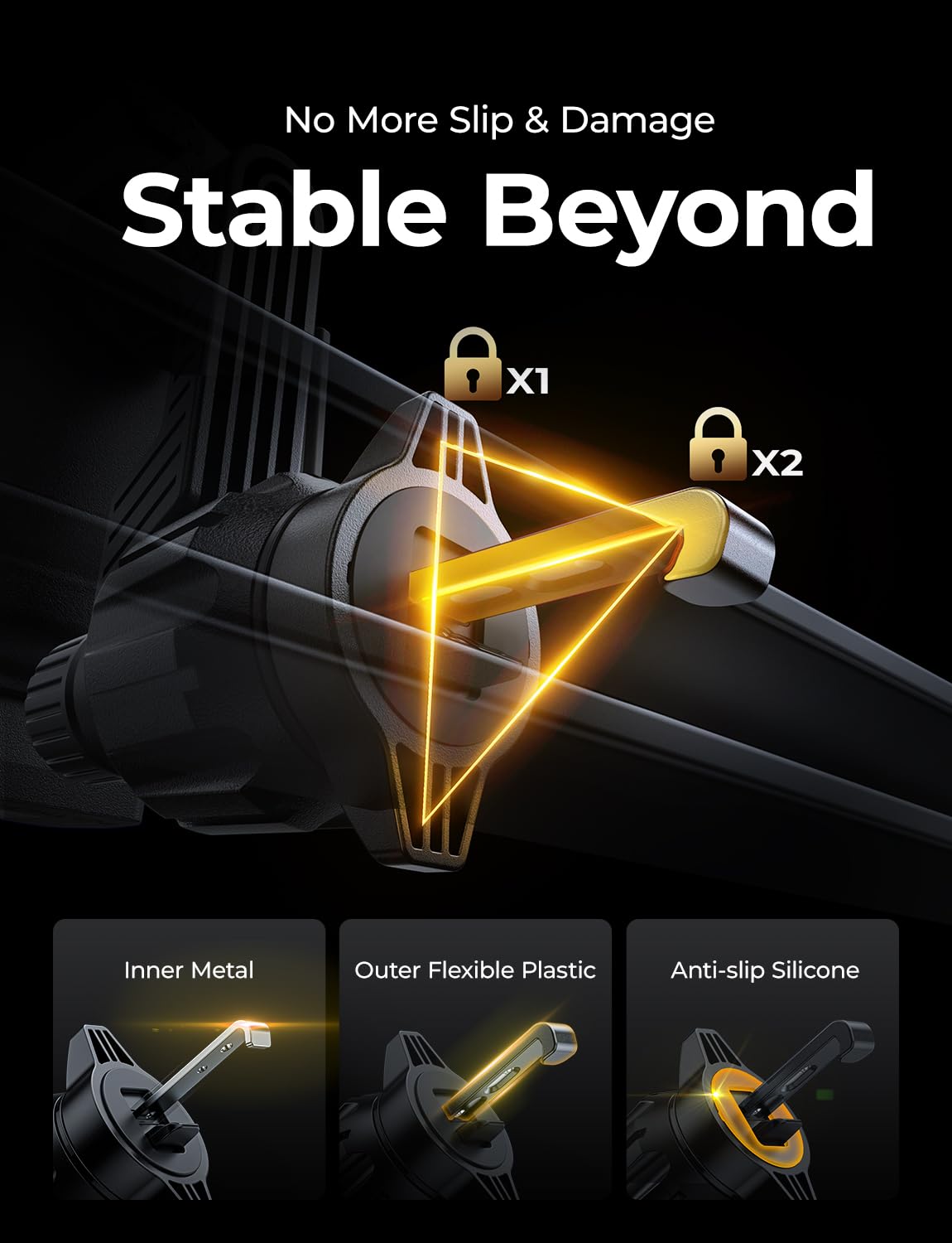 Q: How does the LISEN Phone Mount ensure my phone won't fall while driving?A: The mount features curved half-pack hooks and anti-shake silicone rubber pads that securely wrap around your phone, providing a stable hold without shaking, ensuring that your device remains securely in place during your drive.
