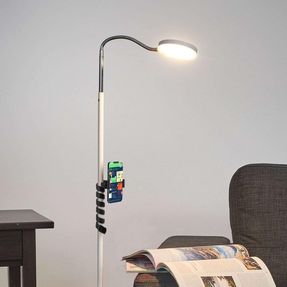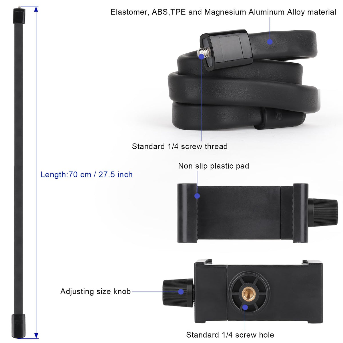Q: How long is the arm of the phone holder, and what materials is it made of?A: The arm of the Mippko phone holder measures 27.5 inches (70 cm) in length. It is constructed from durable materials including Elastomer, ABS, TPE, and Magnesium Aluminum Alloy, ensuring that it is lightweight yet strong enough to hold your phone securely.