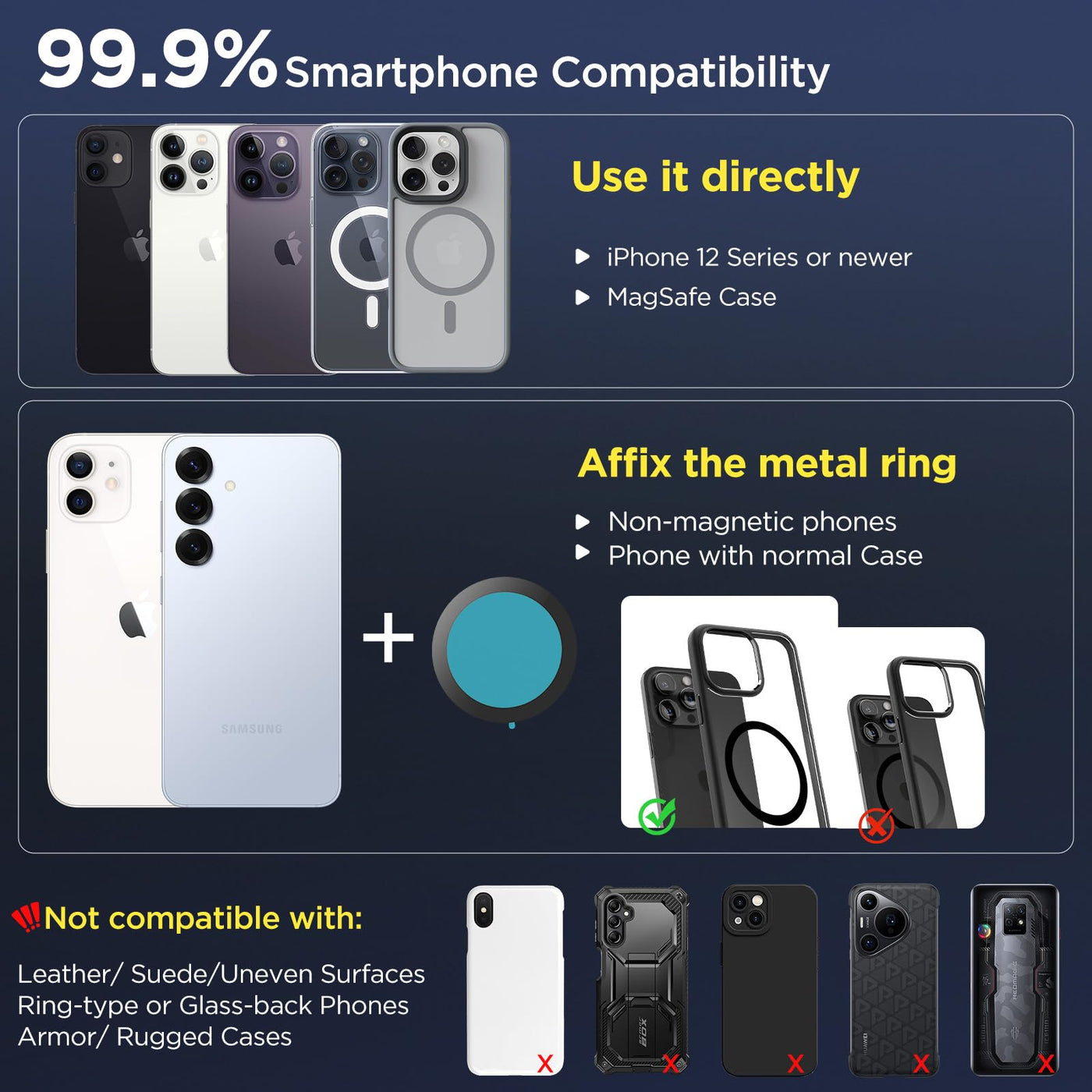 Msxttly Vacuum Magnetic Phone Holder For Car Suction Cup Phone Mount Adjustable Suction Phone Mountdual-Axis Design Offers 360 Rotation, 210 Vertical Adjustment, And Easily Switches Modes. Compact As Airpods Case; Tested For Stability And Reliability.Innovative Vacuum Suction Design Securely Attaches, Easily Removes Without Residue. Stable On Bumps; Use Nano Gel Pad For Rough Surfaces.Equipped With 22 N52 Magnets, The Holder Provides 2200Gf Force, Ensuring A Secure Grip Without Signal Interference In Extreme Conditions.Ideal For Cars And Smooth Surfaces Like Mirrors And Windows. Use Nano Gel For Easy Repositioning Or Pc Pad For Permanent Installation.Compatible With Magsafe Iphones (12-16 Series) And Android Devices; Use Included Magnetic Ring For Stable Connection If Magsafe Isnt Built-In.1*Magsafe Car Phone Holder1*Magsafe Sticker1*Round Pc Pad2*Msxttly Exclusive Nano Gel Pads1*Instruction Manual