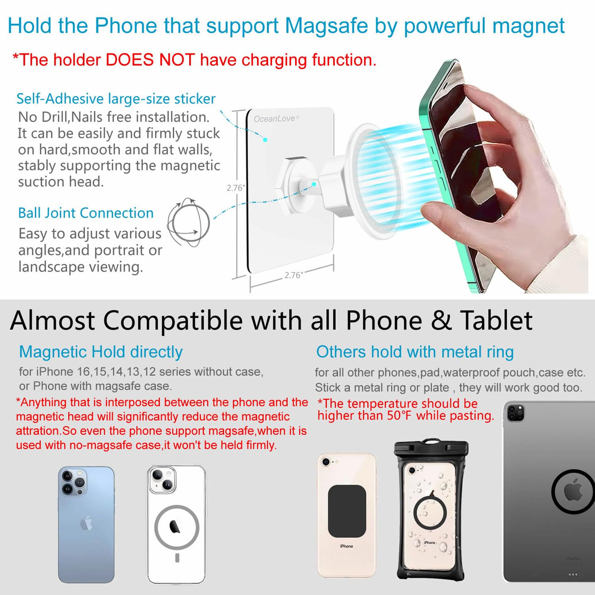 Oceanlove For Magsafe Wall Mount Adhesive Magnetic Waterproof Shower Phone Holder Stand, With Flexible Reusable Sticker, No Drill,Nails Free Installation,Rustproof Oilproof For Iphone 15 Pro Max Plus 14 13 12 And Magsafe Case For Mirror Shower Gym Tile Glass Bathroom Kitchen,Compatible With All Other Phone,Case Or Pad Ipad By Stick The Metal Ring (This Item Includes 1 Free Metal Ring) On The Back Of Them.Tip: The Holder Does Not Have Charging Function.The Joint Ball Of The Mount Has A Diameter Of 0.67 Inch (17 Mm) And Is Compatible With Many Others Various Clip For Car Phone Holders Thar Their The Joint Ball Is Same Diameter .The Phone Screen Can Tilt Downwards, So They Can Be Installed At A Height Where The Water Sprayed By The Shower Head Cannot Reach, Thereby Avoiding Getting Soaked In Water.The Phone Case Will Increase The Distance Between The Holder And The Phone, Significantly Reducing The Magnetic Attraction Force. Therefore, A Thick Non Magsafe Case Will Cause Weak Magnet. In This Case, It Is Necessary To Remove The Phone Case Or Use A Phone Case That Supports Magsafe.