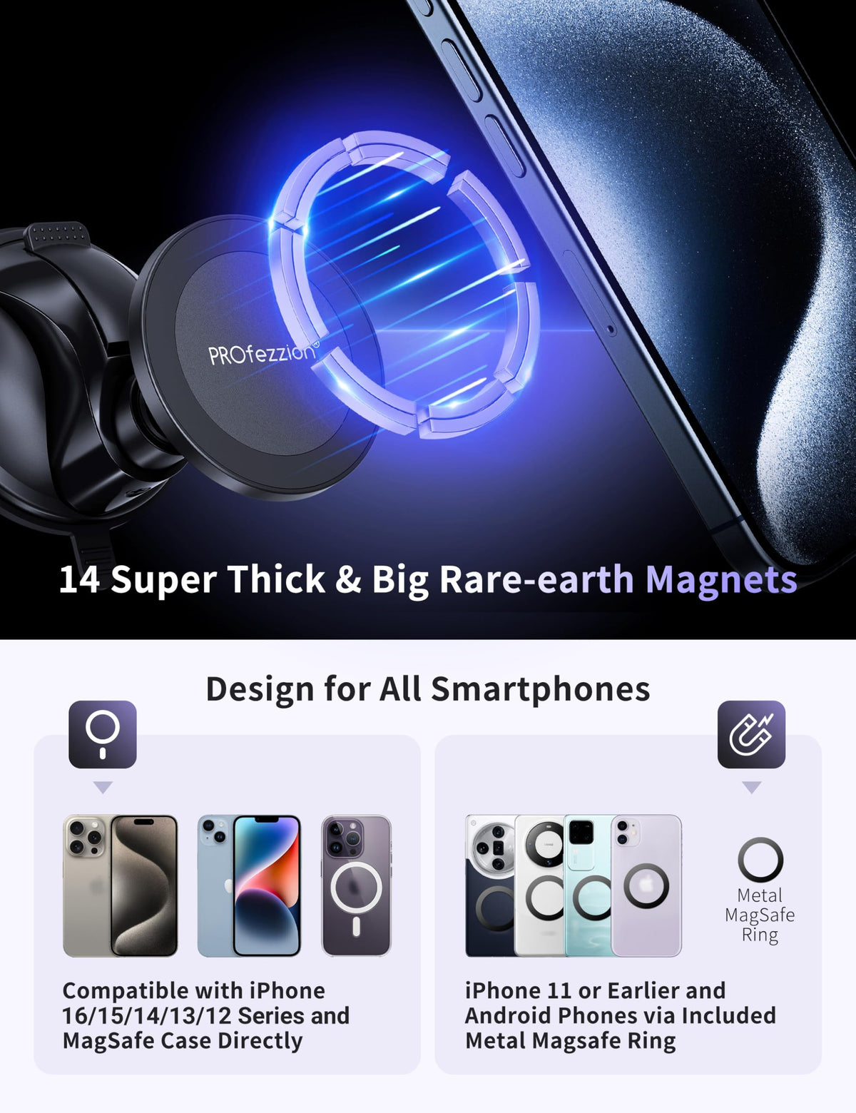 Surprisingly Strong Magnetism: The Front Of Our Phone Mirror Mount Is Made Of Thick And Big Rare-Earth 14Pcs Magnets Delivering Exceptional Durability And Long-Lasting Suction. Enjoy Hands-Free Convenience Now Around The Home Or Office, Including Bathrooms, Mirrors, Doors, Shower Phone Mount The Kitchen, Fridge, Cabinets And Other Smooth Surfaces | Versatile Mounting Options: Never Worry About The Mag Safe Bathroom Phone Holder Leaving Adhesive, Leaving Holes, Or Damaging Delicate Surfaces. Safe To Use On Multiple Smooth Glass, Metal, Tile, Plastic, Mirror And Other Surfaces In Your Home | Super Strong Suction Cup: Durable Tpu Suction Cup Provides Powerful Suction To Firmly Hold Smooth Surfaces For A Safe And Secure Hold Up To 60 Lbs & Lasts For Months | Easy To Use: The Magnetic Phone Holder For Mirror Require No Tools For Setup.Simply Clean The Surface With A Rag, Release The Switch Of The Suction Cup, Then Press The Phone Mirror Mount For Magsafe Firmly On The Surface To Close The Switch To Complete The Installation. To Remove, Just Release The Switch | Multi-Turn Mobile Phone Mount: Effortless One-Handed Operation. Flexible Swivel Ball Head Allows 60 Degrees Tilt Angle Adjustment. Multi-Directioin Design Creats A Stable Viewing In 360 Degrees Rotation. Enjoy More Angles In Addition To Portrait And Landscape Views