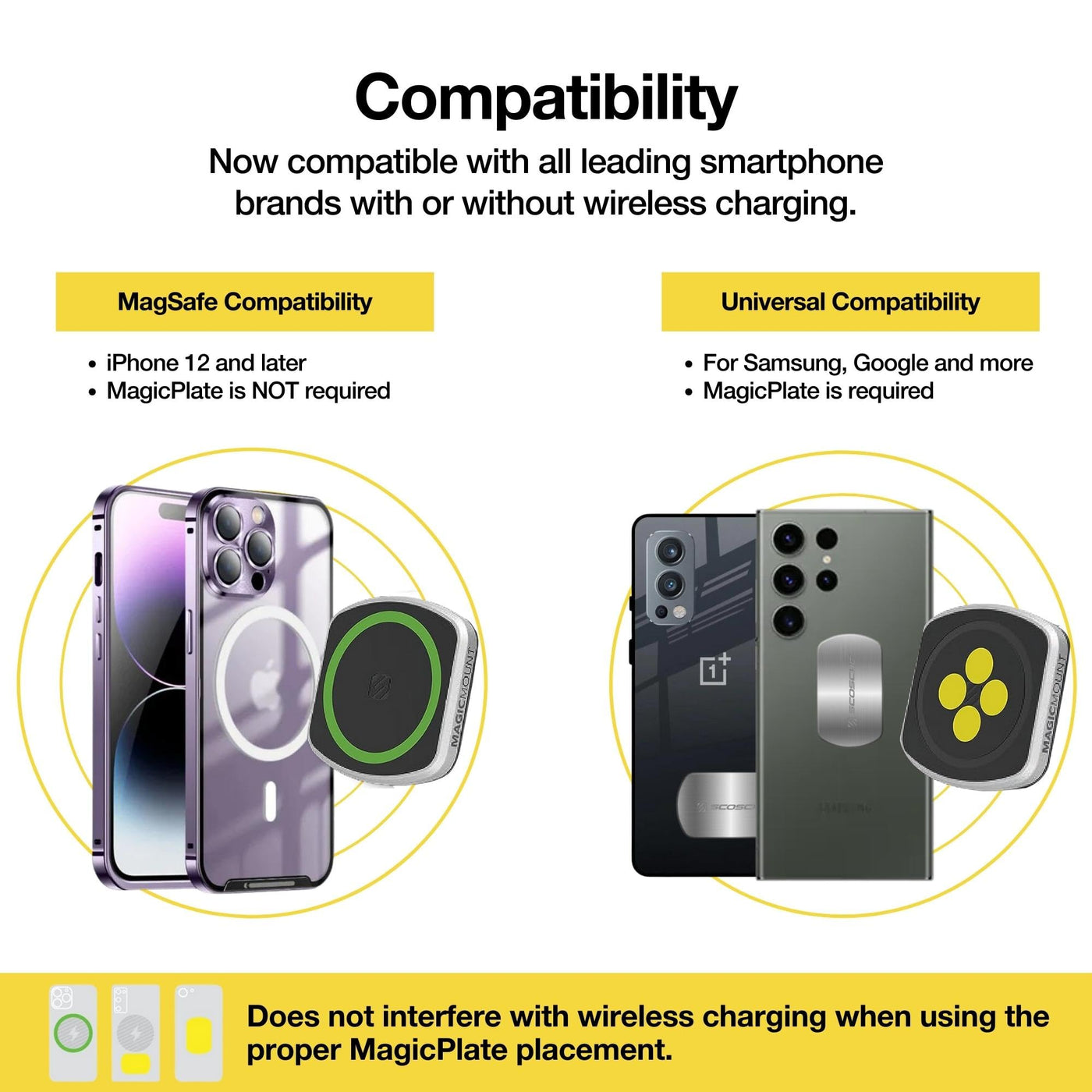 VERSATILE AND SECURE:Our Car Phone holder offers versatile and secure magnetic mounting. The StickGrip suction cup adheres to almost any flat suface for reliable hold while the 4-Axis, 360-degree adjustable head provides convenient viewing from any angle. | STRONG MAGNETIC MOUNT: These magnetic mounts are 30% stronger than those found in our standard MagicMount. This Scosche magnetic phone holder provides a secure and reliable grip for your device while ensuring complete mobile device safety. | MAGSAFE COMPATIBILITY: Our MagSafe mount flawlessly secures iPhone 12, 13, and later models using rare and powerful Neodymium magnets, making it the ideal phone holder. Experience our plateless magnetic mount for added convenience. | 360-DEGREE VIEWING: Elevate your driving with the Scosche Magnetic Car Mount. Customize your viewing angle for navigation and calls. The low-profile design and StickGrip suction cup provides secure hold. Discover the ultimate Scosche car phone accessory. | ULTIMATE DASHBOARD COMPANION: Complete with MagicMount Pro2 phone mount, MagicPlate, protective film, and user manual. Enjoy hands-free calls, GPS, media, and browsing while driving. Stay connected, drive smart.