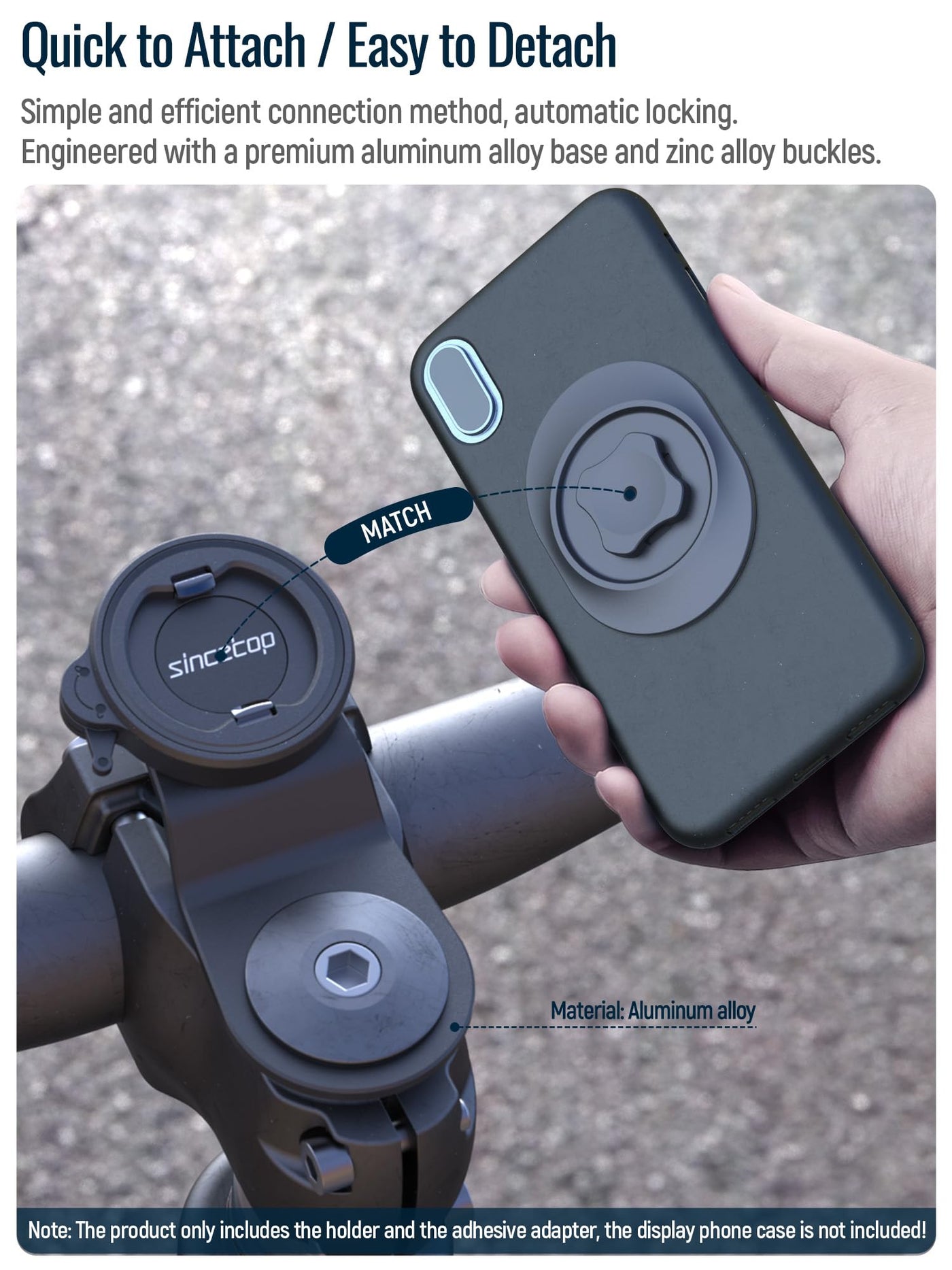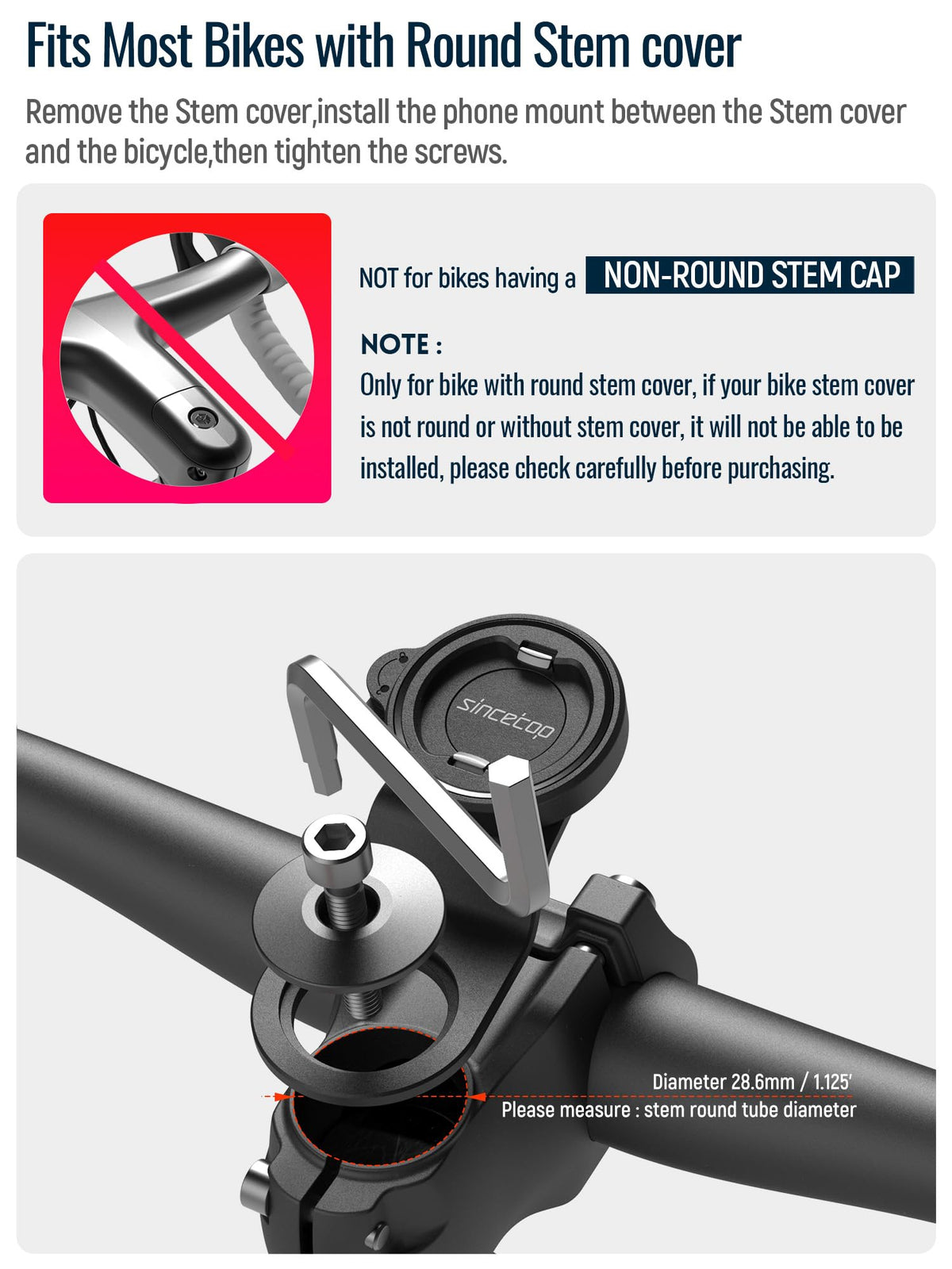 Safe And Reliable Bike Phone Mount Low Profile, Compact Design. One-Hand Operation More Robust And Stable Built-In Ultra-Lock Keeps Your Device Safe On The Wildest Adventures. High Quality 3M Vhb Adhesive, Strong And Robust Enough For Your Mobile Phone. Metal Base Is Durable And Long-Lasting Bicycle Mobile Phone Holder Made Of Superd Aluminum Alloy. Full Access And Compatibility Universal Compatible With Iphone, Galaxy And More Cell Phones. Full Access To All Functions. Easy To Install 1. Remove The Steering Head Cap 2. Insert The Mounting Base And Screw In The Steering Head Cap 3. Wipe The Surface Of The Phone Case And Attach The Adapter To A Suitable Phone Case. 4. Mount Your Phone Directly In The Holder And Then Press The Locking Lever To Lock The Phone To The Holder. 5. To Get Off, Flip Back The Locking Lever And Turn The Phone 90 Clockwise. Warm Tips 1. The 3M Vhb Adhesive Does Not Stick To Smooth, But Not Textured, Non-Porous Surfaces Such As Plastic And Metal. 2. It Will Not Adhere To Rubber, Silicone, Tpu Or Soft-Touch Coatings. 3. Make Sure That The Application Surface Is Thoroughly Cleaned And Dry Before You Apply The Adapter. 4. Let The Adhesive On For 24 Hours Before Use Dry. 5. The 3M Vhb Adhesive Is A Disposable Adhesive. It Is Not Reusable.